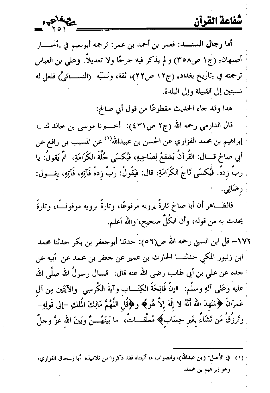 172 - قل ابن السني رحمه الله ص (56): حدثنا أبوجعفر بن بكر حدثنا محمد ابن زنبور المكي حدثنا الحارث بن عمير عن جعفر بن محمد عن أبيه عن جده عن علي بن أبي طالب رضى الله عنه قال: قال رسول الله صلّى الله عليه وعلى آله وسلّم: ((إنّ فاتحة الكتاب وآية الكرسي والآيتين من آل عمران {شهد الله أنّه لا إله إلاّ هو} و {قل اللهمّ مالك الملك -إلى قوله- وترزق من تشاء بغير حساب} معلّقات، ما بينهنّ وبين الله عزّ وجلّ