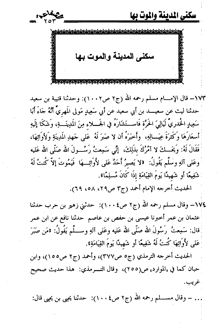 174 - وقال مسلم رحمه الله (ج2 ص1004): حدثني زهير بن حرب حدثنا عثمان بن عمر أخبرنا عيسى بن حفص بن عاصم حدثنا نافع عن ابن عمر قال: سمعت رسول الله صلّى الله عليه وعلى آله وسلّم يقول: ((من صبر على لأوائها كنت له شفيعًا أو شهيدًا يوم القيامة)).