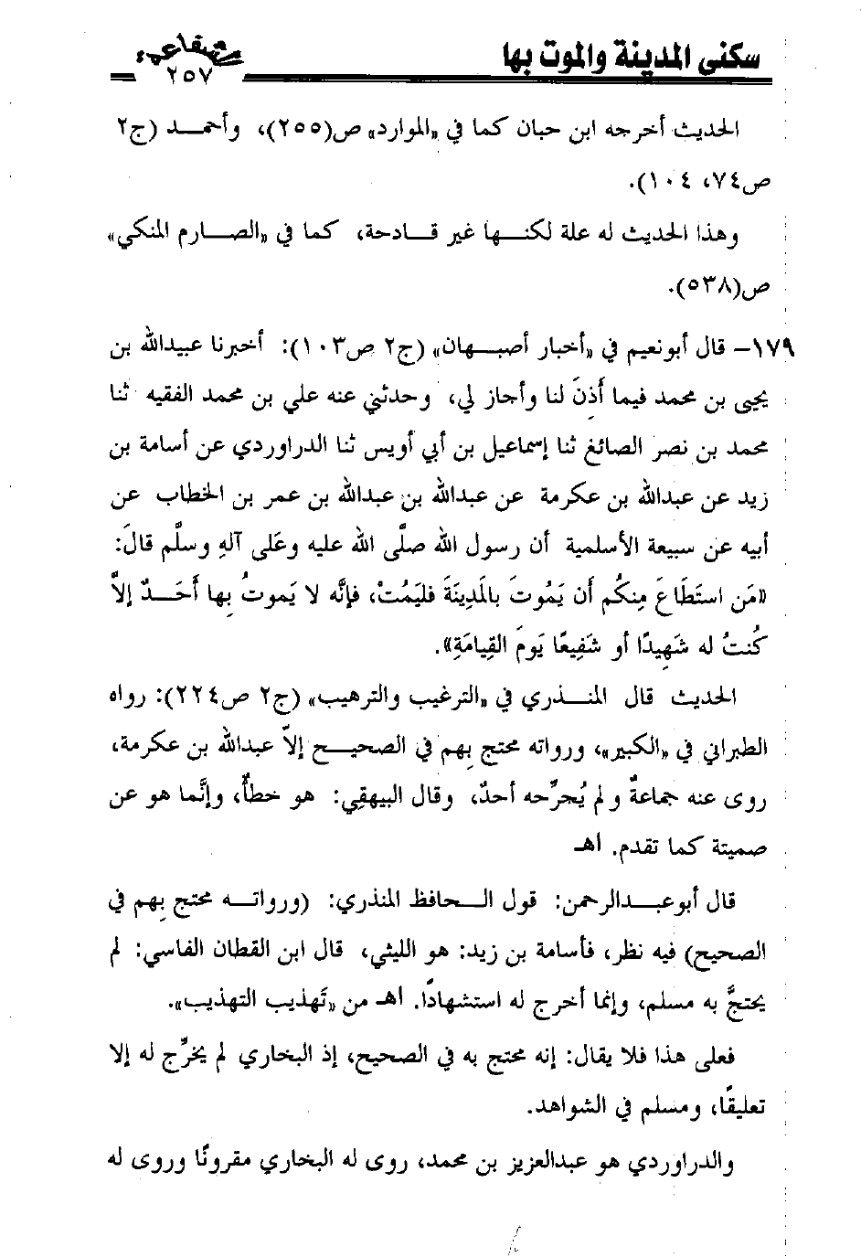 179 - قال أبونعيم في "أخبار أصبهان" (ج2 ص103): أخبرنا عبيد الله بن يحيى بن محمد فيما أذن لنا وأجاز لي، وحدثني عنه علي بن محمد الفقيه ثنا محمد بن نصر الصائغ ثنا إسماعيل بن أبي أويس ثنا الدراوردي عن أسامة بن زيد عن عبد الله بن عكرمة عن عبد الله بن عبد الله بن عمر بن الخطاب عن أبيه عن سبيعة الأسلمية أن رسول الله صلّى الله عليه وعلى آله وسلّم قال: ((من استطاع منكم أن يموت بالمدينة فليمتْ، فإنّه لا يموت بها أحد إلاّ كنت له شهيدًا أو شفيعًا يوم القيامة)).