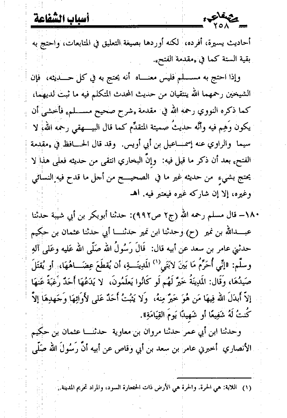 180 - قال مسلم رحمه الله (ج2 ص992): حدثنا أبوبكر بن أبي شيبة حدثنا عبد الله بن نمير (ح) وحدثنا ابن نمير حدثنا أبي حدثنا عثمان بن حكيم حدثني عامر بن سعد عن أبيه قال: قال رسول الله صلّى الله عليه وعلى آله وسلّم: ((إنّي أحرّم ما بين لابتي (¬1) المدينة، أن يقطع عضاهها، أو يقتل صيدها، وقال: المدينة خير لهم لو كانوا يعلمون، لا يدعها أحد رغبةً عنها إلاّ أبدل الله فيها من هو خير منه، ولا يثبت أحد على لأوائها وجهدها إلاّ كنت له شفيعًا أو شهيدًا يوم القيامة)).