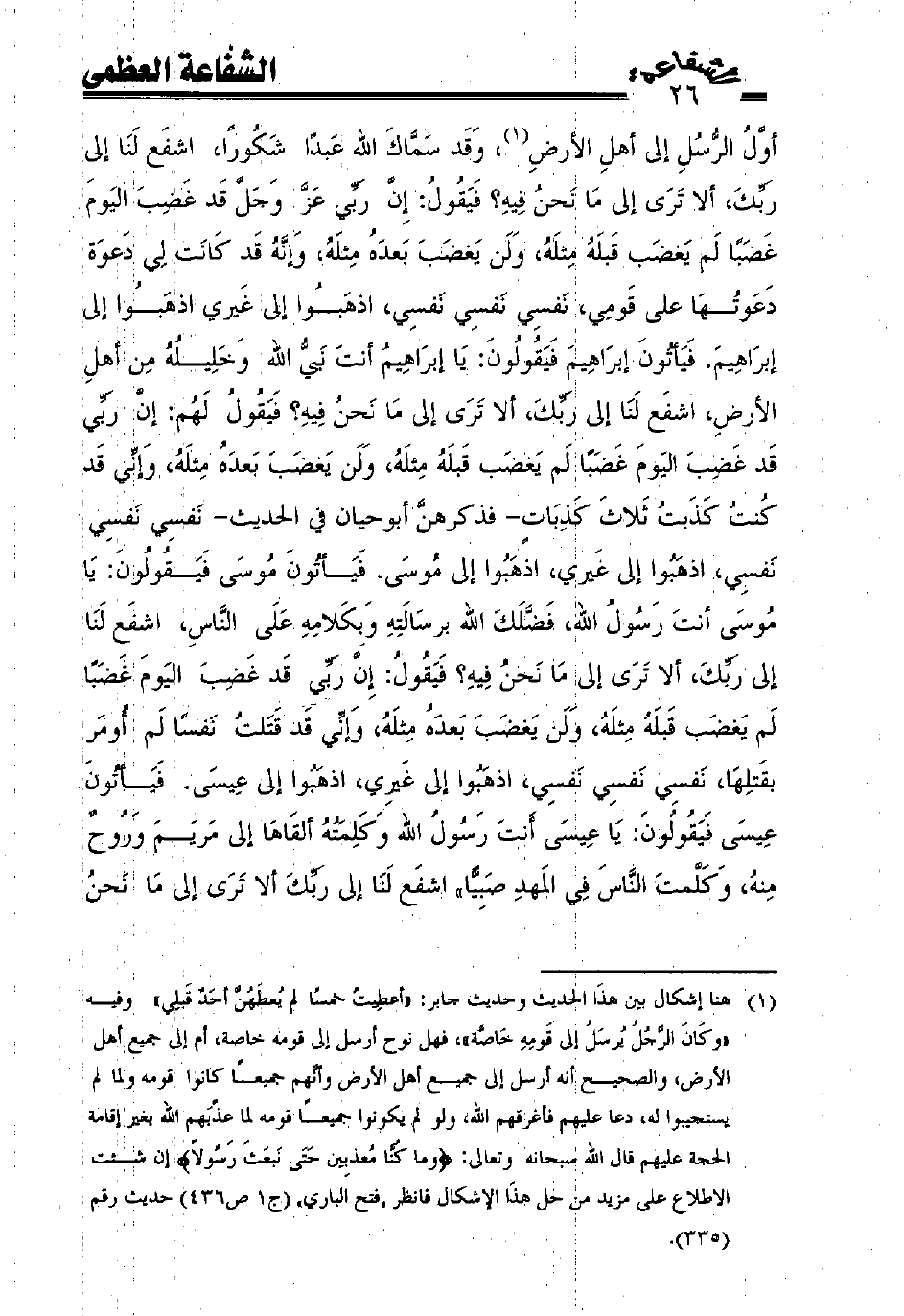 فيأتون إبراهيم فيقولون: يا إبراهيم أنت نبيّ الله وخليله من أهل الأرض، اشفع لنا إلى ربّك، ألا ترى إلى ما نحن فيه؟ فيقول لهم: إنّ ربّي قد غضب اليوم غضبًا لم يغضب قبله مثله، ولن يغضب بعده مثله، وإنّي قد كنت كذبت ثلاث كذبات- فذكرهنّ أبوحيان في الحديث- نفسي نفسي نفسي، اذهبوا إلى غيري، اذهبوا إلى موسى. فيأتون موسى فيقولون: يا موسى أنت رسول الله، فضّلك الله برسالته وبكلامه على النّاس، اشفع لنا إلى ربّك، ألا ترى إلى ما نحن فيه؟ فيقول: إنّ ربّي قد غضب اليوم غضبًا لم يغضب قبله مثله، ولن يغضب بعده مثله، وإنّي قد قتلت نفسًا لم أومر بقتلها، نفسي نفسي نفسي، اذهبوا إلى غيري، اذهبوا إلى عيسى. فيأتون عيسى فيقولون: يا عيسى أنت رسول الله وكلمته ألقاها إلى مريم وروح منه، وكلّمت النّاس في المهد صبيًّا" اشفع لنا إلى ربّك ألا ترى إلى ما نحن