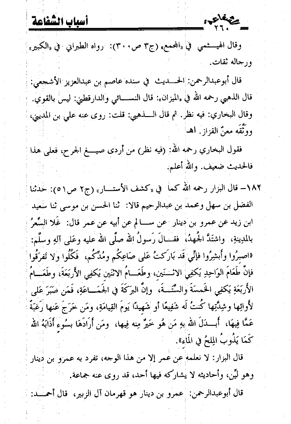 182 - قال البزار رحمه الله كما في "كشف الأستار" (ج2 ص51): حدثنا الفضل بن سهل ومحمد بن عبد الرحيم قالا: ثنا الحسن بن موسى ثنا سعيد ابن زيد عن عمرو بن دينار عن سالم عن أبيه عن عمر قال: غلا السّعر بالمدينة، واشتدّ الجهد، فقال رسول الله صلّى الله عليه وعلى آله وسلّم: ((اصبروا وأبشروا فإنّي قد باركت على صاعكم ومدّكم، فكلوا ولا تفرقوا فإنّ طعام الواحد يكفي الاثنين، وطعام الاثنين يكفي الأربعة، وطعام الأربعة يكفي الخمسة والسّتة، وإنّ البركة في الجماعة، فمن صبر على لأوائها وشدّتها كنت له شفيعًا أو شهيدًا يوم القيامة، ومن خرج عنها رغبةً عمّا فيها، أبدل الله به من هو خير منه فيها، ومن أرادها بسوء أذابه الله كما يذوب الملح في الماء)).