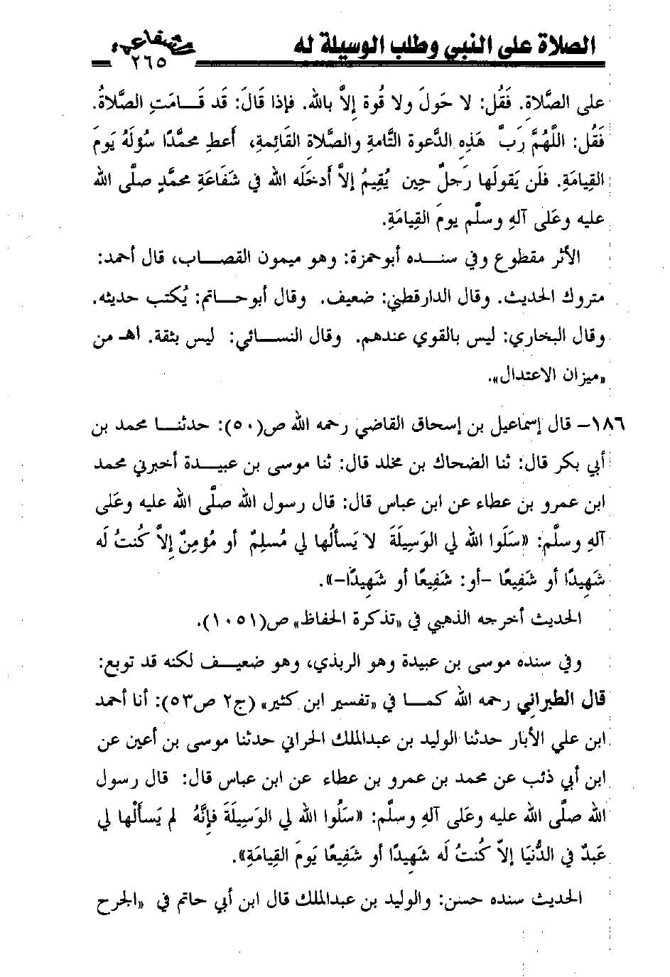 186 - قال إسماعيل بن إسحاق القاضي رحمه الله ص (50): حدثنا محمد بن أبي بكر قال: ثنا الضحاك بن مخلد قال: ثنا موسى بن عبيدة أخبرني محمد ابن عمرو بن عطاء عن ابن عباس قال: قال رسول الله صلّى الله عليه وعلى آله وسلّم: ((سلوا الله لي الوسيلة لا يسألها لي مسلم أو مؤمن إلاّ كنت له شهيدًا أو شفيعًا -أو: شفيعًا أو شهيدًا-)).