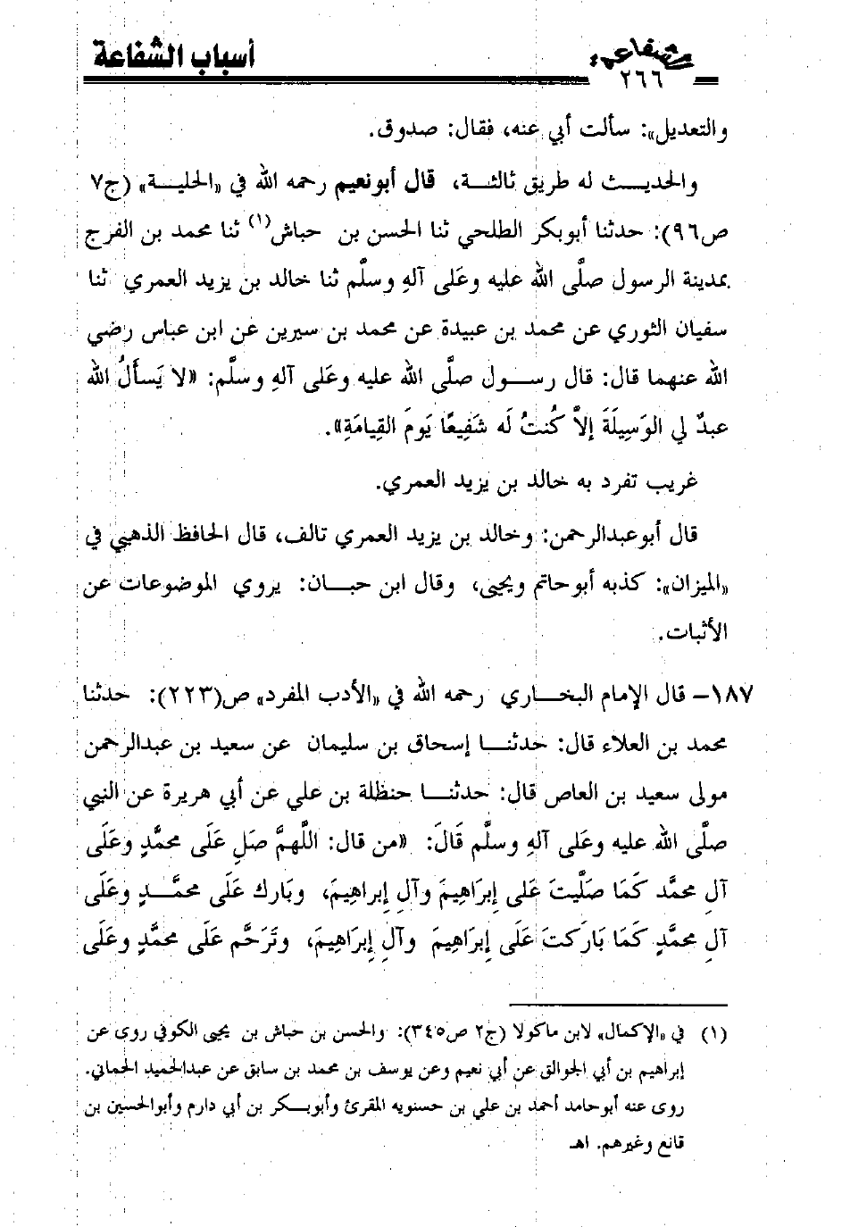 187 - قال الإمام البخاري رحمه الله في "الأدب المفرد" ص (223): حدثنا محمد بن العلاء قال: حدثنا إسحاق بن سليمان عن سعيد بن عبد الرحمن مولى سعيد بن العاص قال: حدثنا حنظلة بن علي عن أبي هريرة عن النبي صلّى الله عليه وعلى آله وسلّم قال: ((من قال: اللهمّ صل على محمّد وعلى آل محمّد كما صلّيت على إبراهيم وآل إبراهيم، وبارك على محمّد وعلى آل محمّد كما باركت على إبراهيم وآل إبراهيم، وترحّم على محمّد وعلى