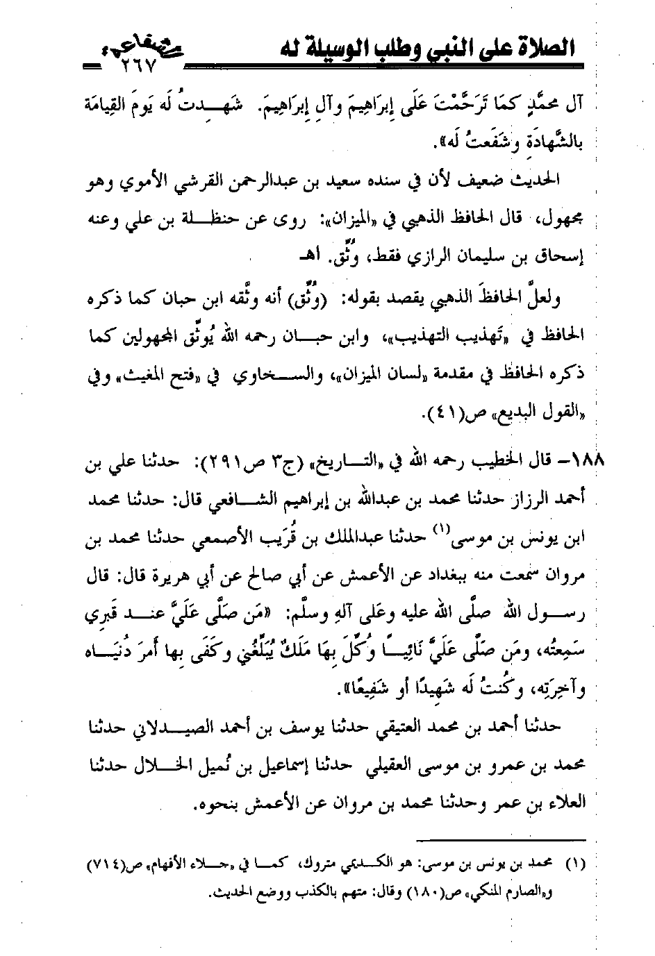188 - قال الخطيب رحمه الله في "التاريخ" (ج3 ص291): حدثنا علي بن أحمد الرزاز حدثنا محمد بن عبد الله بن إبراهيم الشافعي قال: حدثنا محمد ابن يونس بن موسى (¬1) حدثنا عبد الملك بن قريب الأصمعي حدثنا محمد بن مروان سمعت منه ببغداد عن الأعمش عن أبي صالح عن أبي هريرة قال: قال رسول الله صلّى الله عليه وعلى آله وسلّم: ((من صلّى عليّ عند قبري سمعته، ومن صلّى عليّ نائيًا وكّل بها ملك يبلّغني وكفى بها أمر دنياه وآخرته، وكنت له شهيدًا أو شفيعًا)).