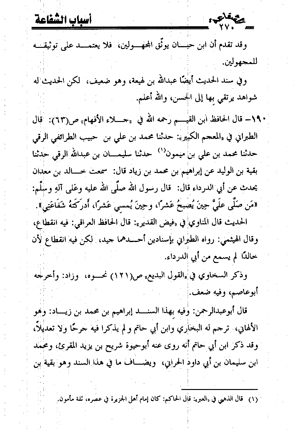 190 - قال الحافظ ابن القيم رحمه الله في "جلاء الأفهام" ص (63): قال الطبراني في "المعجم الكبير": حدثنا محمد بن علي بن حبيب الطرائفي الرقي حدثنا محمد بن علي بن ميمون (¬1) حدثنا سليمان بن عبد الله الرقي حدثنا بقية بن الوليد عن إبراهيم بن محمد بن زياد قال: سمعت خالد بن معدان يحدث عن أبي الدرداء قال: قال رسول الله صلّى الله عليه وعلى آله وسلّم: ((من صلّى عليّ حين يصبح عشرًا، وحين يمسي عشرًا، أدركته شفاعتي)).
