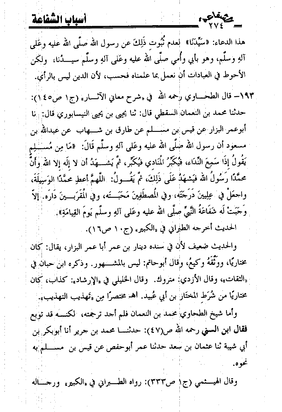 193 - قال الطحاوي رحمه الله في "شرح معاني الآثار" (ج1 ص145): حدثنا محمد بن النعمان السقطي قال: ثنا يحيى بن يحيى النيسابوري قال: نا أبوعمر البزار عن قيس بن مسلم عن طارق بن شهاب عن عبد الله بن مسعود أن رسول الله صلّى الله عليه وعلى آله وسلّم قال: ((ما من مسلم يقول إذا سمع النّداء، فيكبّر المنادي فيكبّر، ثمّ يشهد أن لا إله إلا الله وأنّ محمّدًا رسول الله فيشهد على ذلك، ثمّ يقول: اللهمّ أعط محمّدًا الوسيلة، واجعلْ في عليين درجته، وفي المصطفين محبته، وفي المقربين داره. إلاّ وجبتْ له شفاعة النّبيّ صلّى الله عليه وعلى آله وسلّم يوم القيامة)).