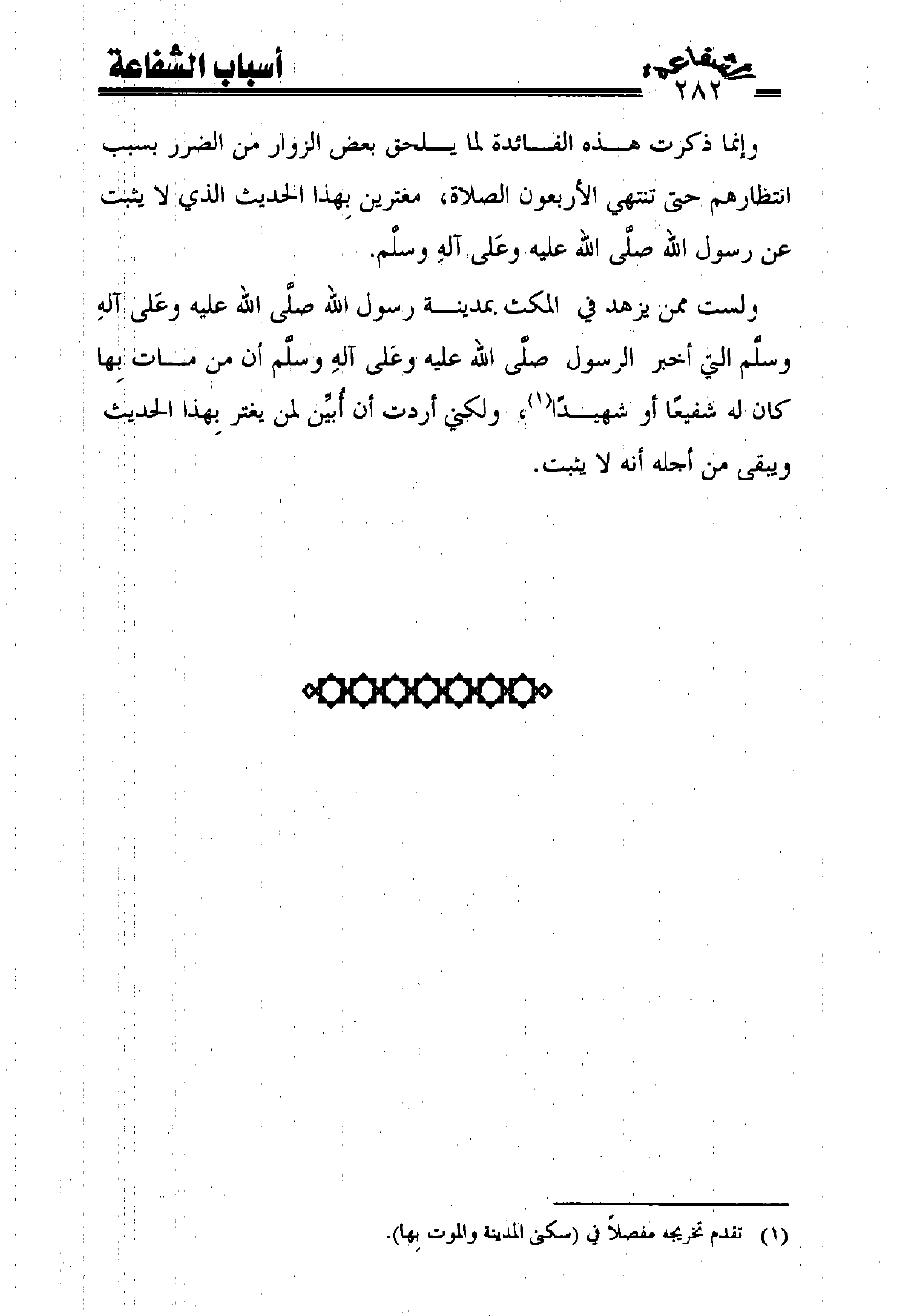 ولست ممن يزهد في المكث بمدينة رسول الله صلّى الله عليه وعلى آله وسلّم التي أخبر الرسول صلّى الله عليه وعلى آله وسلّم أن من مات بها كان له شفيعًا أو شهيدًا (¬1)، ولكني أردت أن أبيّن لمن يغتر بهذا الحديث ويبقى من أجله أنه لا يثبت.