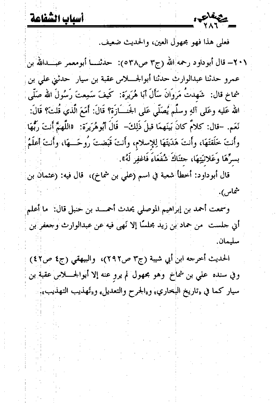 201 - قال أبوداود رحمه الله (ج3 ص538): حدثنا أبومعمر عبد الله بن عمرو حدثنا عبد الوارث حدثنا أبوالجلاس عقبة بن سيار حدثني علي بن شماخ قال: شهدت مروان سأل أبا هريرة: كيف سمعت رسول الله صلّى الله عليه وعلى آله وسلّم يصلّي على الجنازة؟ قال: أمع الّذي قلت؟ قال: نعم. -قال: كلام كان بينهما قبل ذلك- قال أبوهريرة: ((اللهمّ أنت ربّها وأنت خلقتها، وأنت هديتها للإسلام، وأنت قبضت روحها، وأنت أعلم بسرّها وعلانيتها، جئناك شفعاء فاغفر له)).