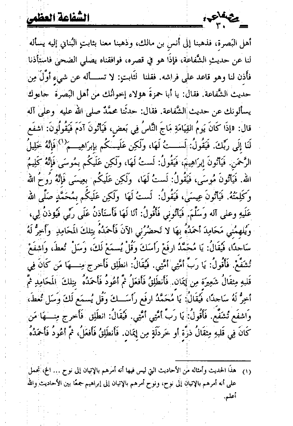 أهل البصرة، فذهبنا إلى أنس بن مالك، وذهبنا معنا بثابت البناني إليه يسأله لنا عن حديث الشّفاعة، فإذا هو في قصره، فوافقناه يصلي الضحى فاستأذنا فأذن لنا وهو قاعد على فراشه. فقلنا لثابت: لا تسأله عن شيء أوّل من حديث الشّفاعة. فقال: يا أبا حمزة هؤلاء إخوانك من أهل البصرة جاءوك يسألونك عن حديث الشّفاعة. فقال: حدثنا محمّد صلى الله عليه وعلى آله قال: ((إذا كان يوم القيامة ماج النّاس في بعض، فيأتون آدم فيقولون: اشفع لنا إلى ربّك. فيقول: لست لها، ولكن عليكم بإبراهيم (¬1) فإنّه خليل الرّحمن. فيأتون إبراهيم، فيقول: لست لها، ولكن عليكم بموسى فإنّه كليم الله. فيأتون موسى، فيقول: لست لها، ولكن عليكم بعيسى فإنّه روح الله وكلمته. فيأتون عيسى، فيقول: لست لها ولكن عليكم بمحمّد صلّى الله عليه وعلى آله وسلّم. فيأتوني فأقول: أنا لها فأستأذن على ربّي فيؤذن لي، ويلهمني محامد أحمده بها لا تحضرني الآن فأحمده بتلك المحامد وأخرّ له ساجدًا، فيقال: يا محمّد ارفعْ رأسك وقلْ يسمعْ لك، وسلْ تعط، واشفعْ تشفّعْ. فأقول: يا ربّ أمّتي أمّتي. فيقال: انطلق فأخرج منها من كان في قلبه مثقال شعيرة من إيمان. فأنطلق فأفعل ثمّ أعود فأحمده بتلك المحامد ثمّ أخرّ له ساجدًا، فيقال: يا محمّد ارفع رأسك وقل يسمع لك وسل تعط، واشفع تشفّع. فأقول: يا ربّ أمّتي أمّتي. فيقال: انطلق فأخرج منها من كان في قلبه مثقال ذرّة أو خردلة من إيمان. فأنطلق فأفعل، ثمّ أعود فأحمده