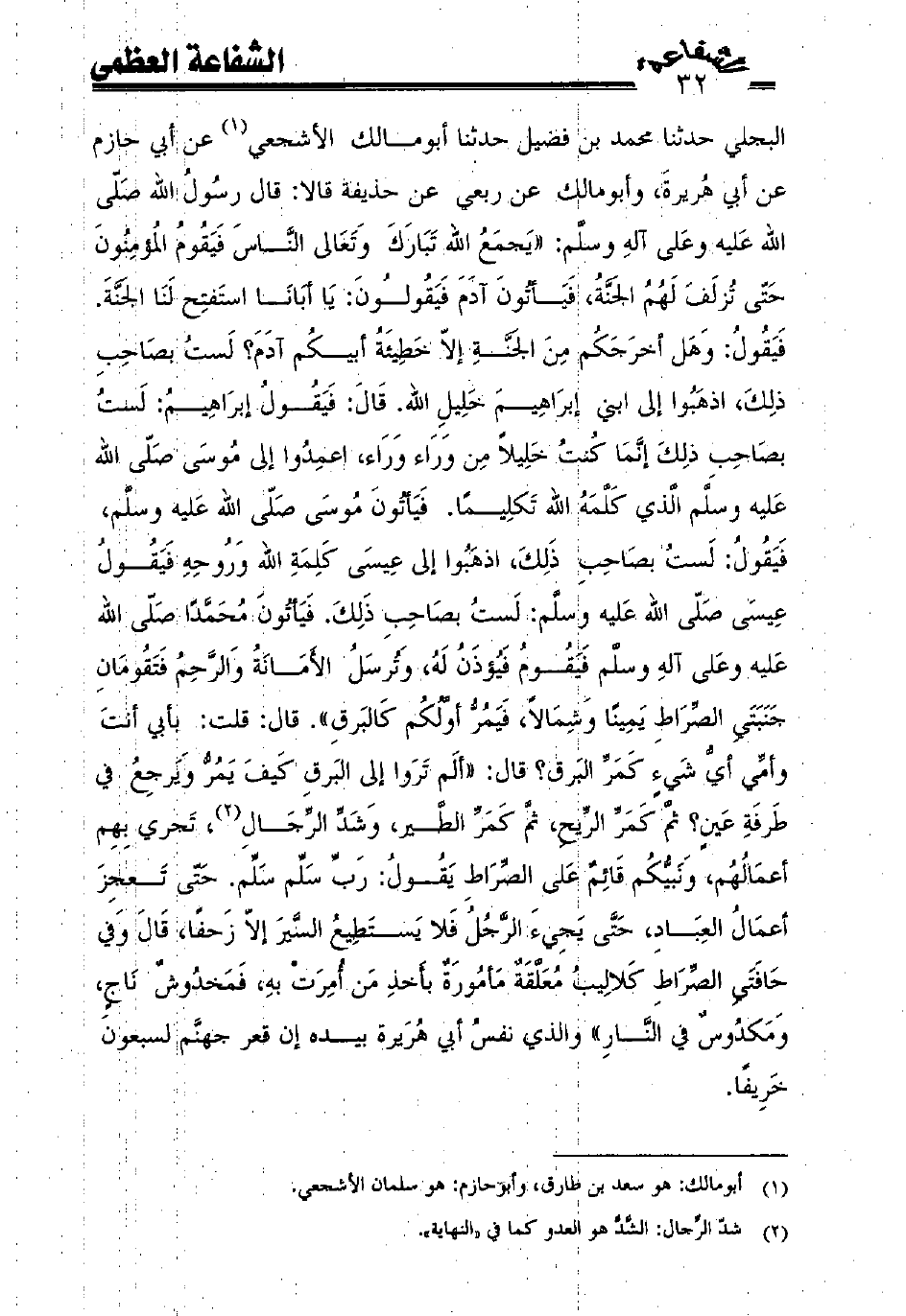 البجلي حدثنا محمد بن فضيل حدثنا أبومالك الأشجعي (¬1) عن أبي حازم عن أبي هريرة، وأبومالك عن ربعي عن حذيفة قالا: قال رسول الله صلّى الله عليه وعلى آله وسلّم: ((يجمع الله تبارك وتعالى النّاس فيقوم المؤمنون حتّى تزلف لهم الجنّة، فيأتون آدم فيقولون: يا أبانا استفتح لنا الجنّة. فيقول: وهل أخرجكم من الجنّة إلاّ خطيئة أبيكم آدم؟ لست بصاحب ذلك، اذهبوا إلى ابني إبراهيم خليل الله. قال: فيقول إبراهيم: لست بصاحب ذلك إنّما كنت خليلاً من وراء وراء، اعمدوا إلى موسى صلّى الله عليه وسلّم الّذي كلّمه الله تكليمًا. فيأتون موسى صلّى الله عليه وسلّم، فيقول: لست بصاحب ذلك، اذهبوا إلى عيسى كلمة الله وروحه فيقول عيسى صلّى الله عليه وسلّم: لست بصاحب ذلك. فيأتون محمّدًا صلّى الله عليه وعلى آله وسلّم فيقوم فيؤذن له، وترسل الأمانة والرّحم فتقومان جنبتي الصّراط يمينًا وشمالاً، فيمرّ أوّلكم كالبرق)). قال: قلت: بأبي أنت وأمّي أيّ شيء كمرّ البرق؟ قال: ((ألم تروا إلى البرق كيف يمرّ ويرجع في طرفة عين؟ ثمّ كمرّ الرّيح، ثمّ كمرّ الطّير، وشدّ الرّجال (¬2)، تجري بهم أعمالهم، ونبيّكم قائم على الصّراط يقول: ربّ سلّم سلّم. حتّى تعجز أعمال العباد، حتّى يجيء الرّجل فلا يستطيع السّير إلاّ زحفًا، قال وفي حافتي الصّراط كلاليب معلّقة مأمورة بأخذ من أمرتْ به، فمخدوش ناج، ومكدوس في النّار)) والذي نفس أبي هريرة بيده إن قعر جهنّم لسبعون خريفًا.
