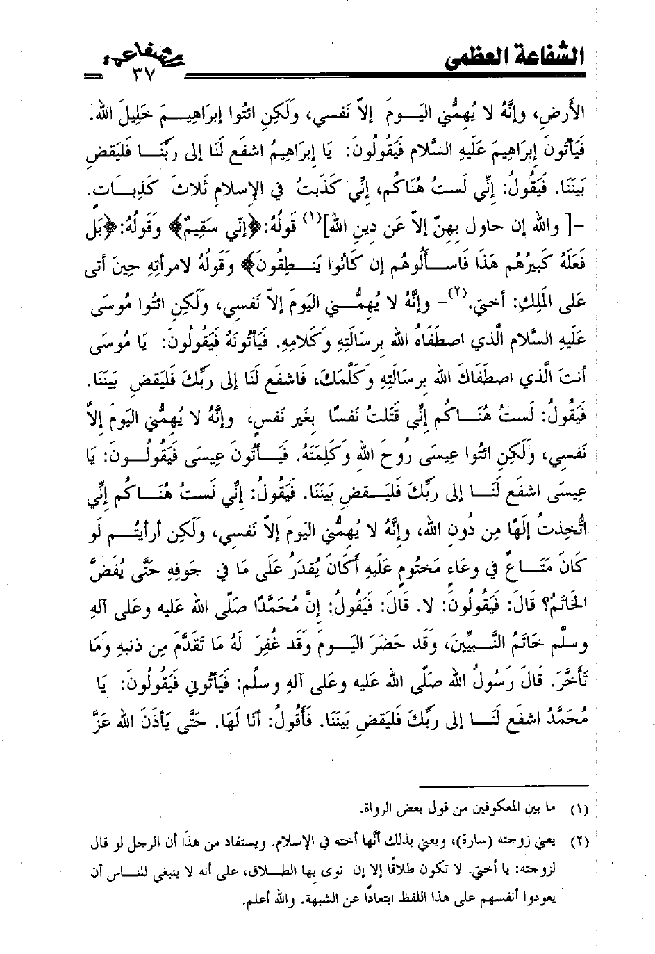 الأرض، وإنّه لا يهمّني اليوم إلاّ نفسي، ولكن ائتوا إبراهيم خليل الله. فيأتون إبراهيم عليه السّلام فيقولون: يا إبراهيم اشفع لنا إلى ربّنا فليقض بيننا. فيقول: إنّي لست هناكم، إنّي كذبت في الإسلام ثلاث كذبات. -[والله إن حاول بهنّ إلاّ عن دين الله] (¬1) قوله: {إنّي سقيم} وقوله: {بل فعله كبيرهم هذا فاسألوهم إن كانوا ينطقون} وقوله لامرأته حين أتى على الملك: أختي. (¬2) - وإنّه لا يهمّني اليوم إلاّ نفسي، ولكن ائتوا موسى عليه السّلام الّذي اصطفاه الله برسالته وكلامه. فيأتونه فيقولون: يا موسى أنت الّذي اصطفاك الله برسالته وكلّمك، فاشفع لنا إلى ربّك فليقض بيننا.