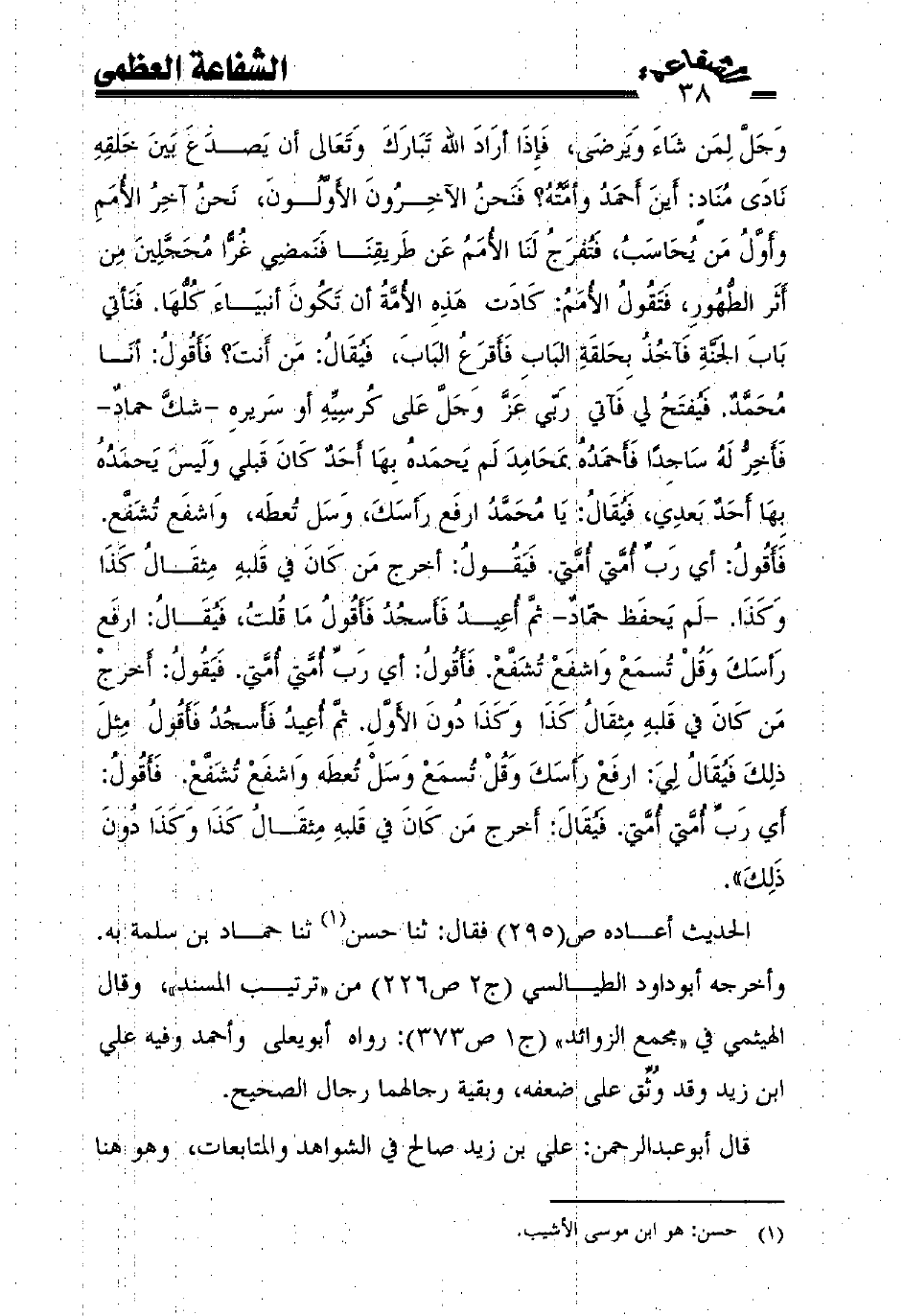 وجلّ لمن شاء ويرضى، فإذا أراد الله تبارك وتعالى أن يصدع بين خلقه نادى مناد: أين أحمد وأمّته؟ فنحن الآخرون الأوّلون، نحن آخر الأمم وأوّل من يحاسب، فتفرج لنا الأمم عن طريقنا فنمضي غرًّا محجّلين من أثر الطّهور، فتقول الأمم: كادت هذه الأمّة أن تكون أنبياء كلّها. فنأتي باب الجنّة فآخذ بحلقة الباب فأقرع الباب، فيقال: من أنت؟ فأقول: أنا محمّد. فيفتح لي فآتي ربّي عزّ وجلّ على كرسيّه أو سريره -شكّ حماد- فأخرّ له ساجدًا فأحمده بمحامد لم يحمده بها أحد كان قبلي وليس يحمده بها أحد بعدي، فيقال: يا محمّد ارفع رأسك، وسل تعطه، واشفع تشفّع. فأقول: أي ربّ أمّتي أمّتي. فيقول: أخرج من كان في قلبه مثقال كذا وكذا. -لم يحفظ حمّاد- ثمّ أعيد فأسجد فأقول ما قلت، فيقال: ارفع رأسك وقلْ تسمعْ واشفعْ تشفّعْ. فأقول: أي ربّ أمّتي أمّتي. فيقول: أخرجْ من كان في قلبه مثقال كذا وكذا دون الأوّل. ثمّ أعيد فأسجد فأقول مثل ذلك فيقال لي: ارفعْ رأسك وقلْ تسمعْ وسلْ تعطه واشفعْ تشفّعْ. فأقول: أي ربّ أمّتي أمّتي. فيقال: أخرج من كان في قلبه مثقال كذا وكذا دون ذلك)).