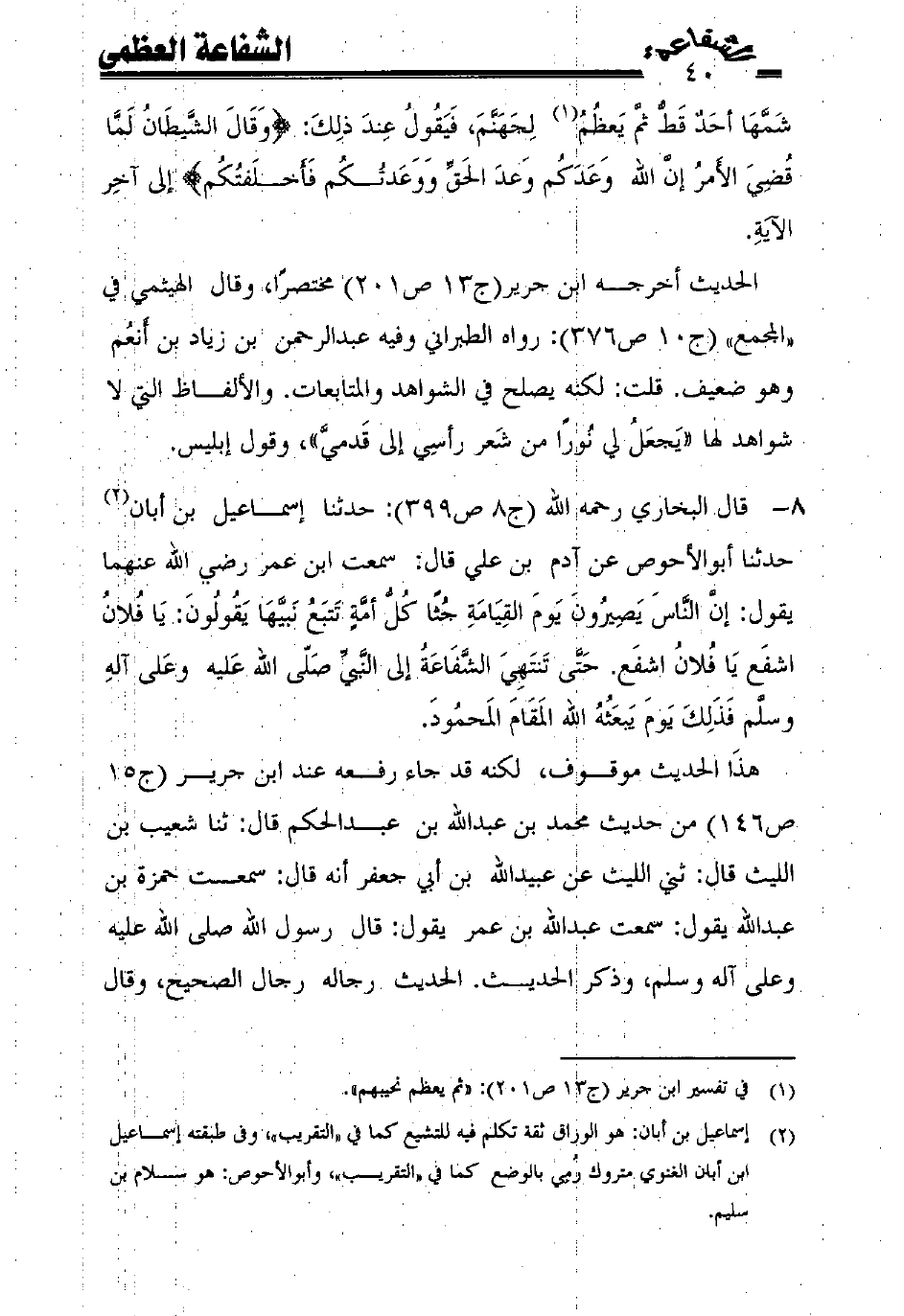8 - قال البخاري رحمه الله (ج8 ص399): حدثنا إسماعيل بن أبان (¬2) حدثنا أبوالأحوص عن آدم بن علي قال: سمعت ابن عمر رضى الله عنهما يقول: إنّ النّاس يصيرون يوم القيامة جثًا كلّ أمّة تتبع نبيّها يقولون: يا فلان اشفع يا فلان اشفع. حتّى تنتهي الشّفاعة إلى النّبيّ صلّى الله عليه وعلى آله وسلّم فذلك يوم يبعثه الله المقام المحمود.