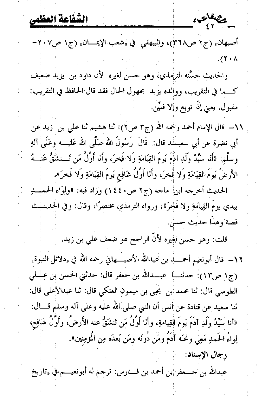 11 - قال الإمام أحمد رحمه الله (ج3 ص2): ثنا هشيم ثنا علي بن زيد عن أبي نضرة عن أبي سعيد قال: قال رسول الله صلّى الله عليه وعلى آله وسلّم: ((أنا سيّد ولد آدم يوم القيامة ولا فخر، وأنا أوّل من تنشقّ عنه الأرض يوم القيامة ولا فخر، وأنا أوّل شافع يوم القيامة ولا فخر)).