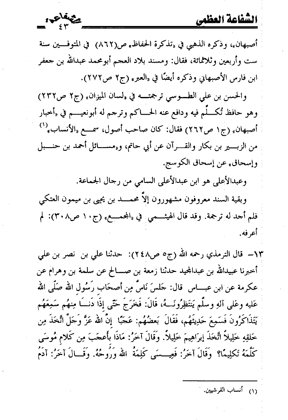 13 - قال الترمذي رحمه الله (ج5 ص248): حدثنا علي بن نصر بن علي أخبرنا عبيد الله بن عبد المجيد حدثنا زمعة بن صالح عن سلمة بن وهرام عن عكرمة عن ابن عباس قال: جلس ناس من أصحاب رسول الله صلّى الله عليه وعلى آله وسلّم ينتظرونه، قال: فخرج حتّى إذا دنا منهم سمعهم يتذاكرون فسمع حديثهم، فقال بعضهم: عجبًا إنّ الله عزّ وجلّ اتّخذ من خلقه خليلاً اتّخذ إبراهيم خليلاً. وقال آخر: ماذا بأعجب من كلام موسى كلّمه تكليمًا؟ وقال آخر: فعيسى كلمة الله وروحه. وقال آخر: آدم