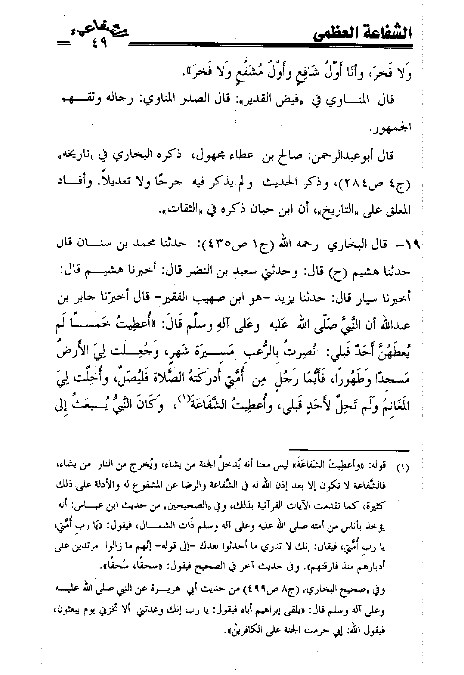 19 - قال البخاري رحمه الله (ج1 ص435): حدثنا محمد بن سنان قال حدثنا هشيم (ح) قال: وحدثني سعيد بن النضر قال: أخبرنا هشيم قال: أخبرنا سيار قال: حدثنا يزيد -هو ابن صهيب الفقير- قال أخبرنا جابر بن عبد الله أن النّبيّ صلّى الله عليه وعلى آله وسلّم قال: ((أعطيت خمسًا لم يعطهنّ أحد قبلي: نصرت بالرّعب مسيرة شهر، وجعلت لي الأرض مسجدًا وطهورًا، فأيّما رجل من أمّتي أدركته الصّلاة فليصلّ، وأحلّت لي المغانم ولم تحلّ لأحد قبلي، وأعطيت الشّفاعة (¬1)، وكان النّبيّ يبعث إلى
