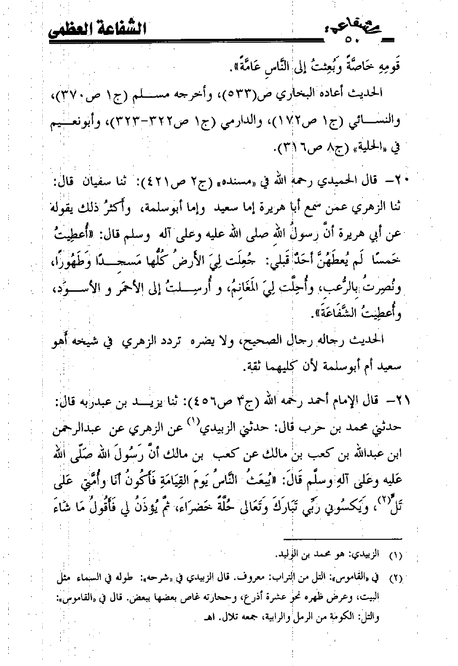 20 - قال الحميدي رحمه الله في "مسنده" (ج2 ص421): ثنا سفيان قال: ثنا الزهري عمن سمع أبا هريرة إما سعيد وإما أبوسلمة، وأكثر ذلك يقوله عن أبي هريرة أنّ رسول الله صلى الله عليه وعلى آله وسلم قال: ((أعطيت خمسًا لم يعطهنّ أحد قبلي: جعلت لي الأرض كلّها مسجدًا وطهورًا، ونصرت بالرّعب، وأحلّت لي المغانم، وأرسلت إلى الأحمر والأسود، وأعطيت الشّفاعة)).