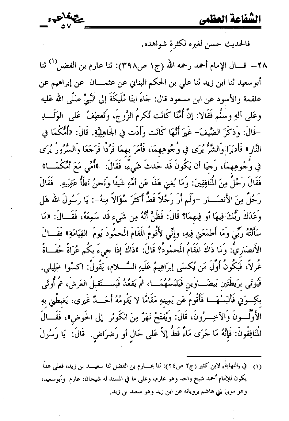 28 - قال الإمام أحمد رحمه الله (ج1 ص398): ثنا عارم بن الفضل (¬1) ثنا أبوسعيد ثنا ابن زيد ثنا علي بن الحكم البناني عن عثمان عن إبراهيم عن علقمة والأسود عن ابن مسعود قال: جاء ابنا مليكة إلى النّبيّ صلّى الله عليه وعلى آله وسلّم فقالا: إنّ أمّنا كانت تكرم الزّوج، وتعطف على الولد -قال: وذكر الضّيف- غير أنّها كانت وأدت في الجاهليّة. قال: ((أمّكما في النّار)) فأدبرا والشّرّ يرى في وجوههما، فأمر بهما فردّا فرجعا والسّرور يرى في وجوههما، رجيا أن يكون قد حدث شيء، فقال: ((أمّي مع أمّكما)) فقال رجل من المنافقين: وما يغني هذا عن أمّه شيئًا ونحن نطأ عقبيه. فقال رجل من الأنصار -ولم أر رجلاً قطّ أكثر سؤالاً منه-: يا رسول الله هل وعدك ربّك فيها أو فيهما؟ قال: فظنّ أنّه من شيء قد سمعه، فقال: ((ما سألته ربّي وما أطمعني فيه، وإنّي لأقوم المقام المحمود يوم القيامة)) فقال الأنصاريّ: وما ذاك المقام المحمود؟ قال: ((ذاك إذا جيء بكم عراةً حفاةً غرلاً، فيكون أوّل من يكسى إبراهيم عليه السّلام، يقول: اكسوا خليلي. فيؤتى بريطتين بيضاوين فيلبسهما، ثمّ يقعد فيستقبل العرش، ثمّ أوتى بكسوتي فألبسها فأقوم عن يمينه مقامًا لا يقومه أحد غيري، يغبطني به الأوّلون والآخرون، قال: ويفتح نهر من الكوثر إلى الحوض))، فقال المنافقون: فإنّه ما جرى ماء قطّ إلاّ على حال أو رضراض. قال: يا رسول
