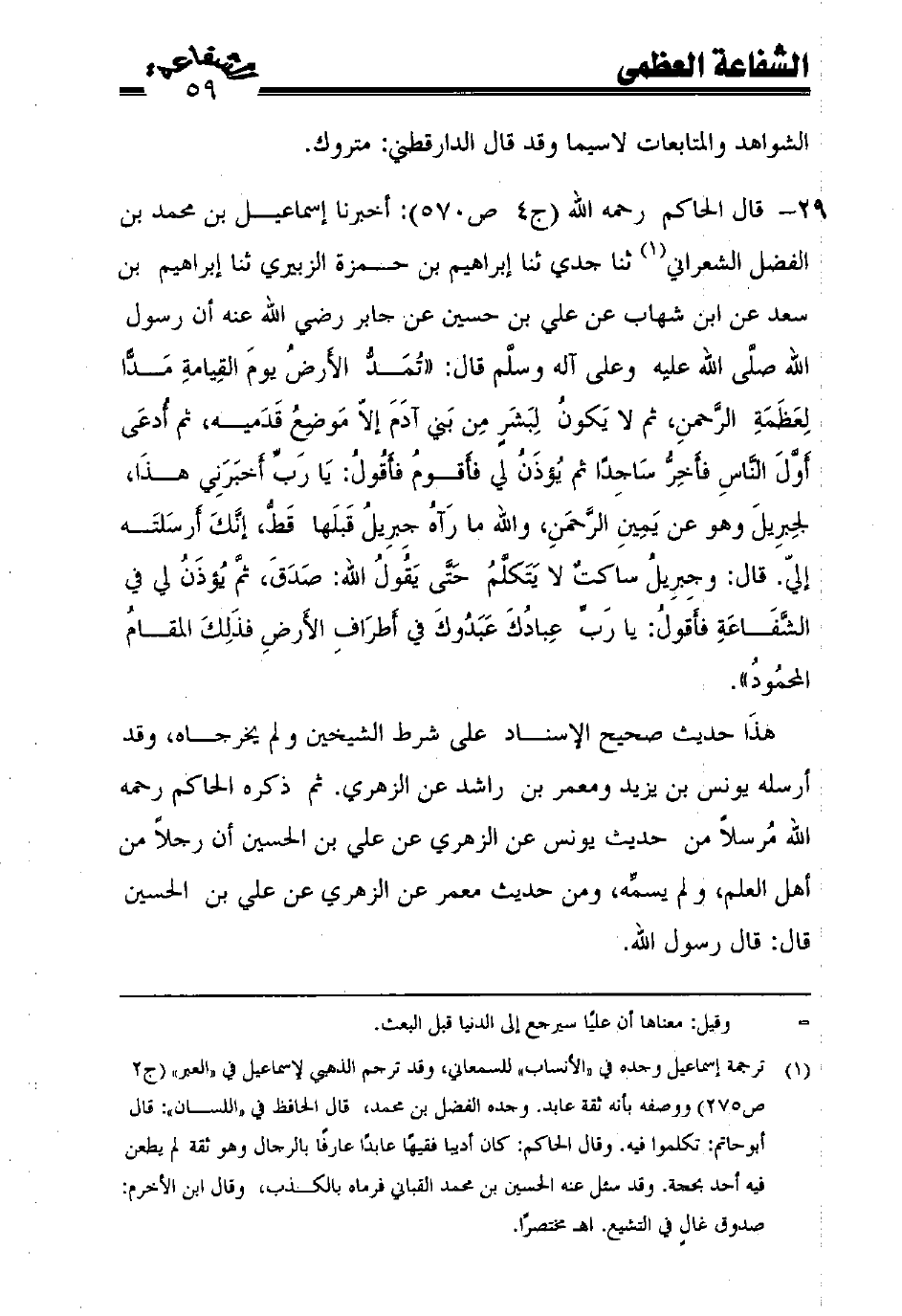 29 - قال الحاكم رحمه الله (ج4 ص570): أخبرنا إسماعيل بن محمد بن الفضل الشعراني (¬1) ثنا جدي ثنا إبراهيم بن حمزة الزبيري ثنا إبراهيم بن سعد عن ابن شهاب عن علي بن حسين عن جابر رضي الله عنه أن رسول الله صلّى الله عليه وعلى آله وسلّم قال: ((تمدّ الأرض يوم القيامة مدًّا لعظمة الرّحمن، ثم لا يكون لبشر من بني آدم إلاّ موضع قدميه، ثم أدعى أوّل النّاس فأخرّ ساجدًا ثم يؤذن لي فأقوم فأقول: يا ربّ أخبرني هذا، لجبريل وهو عن يمين الرّحمن، والله ما رآه جبريل قبلها قطّ، إنّك أرسلته إليّ. قال: وجبريل ساكت لا يتكلّم حتّى يقول الله: صدق، ثمّ يؤذن لي في الشّفاعة فأقول: يا ربّ عبادك عبدوك في أطراف الأرض فذلك المقام المحمود)).