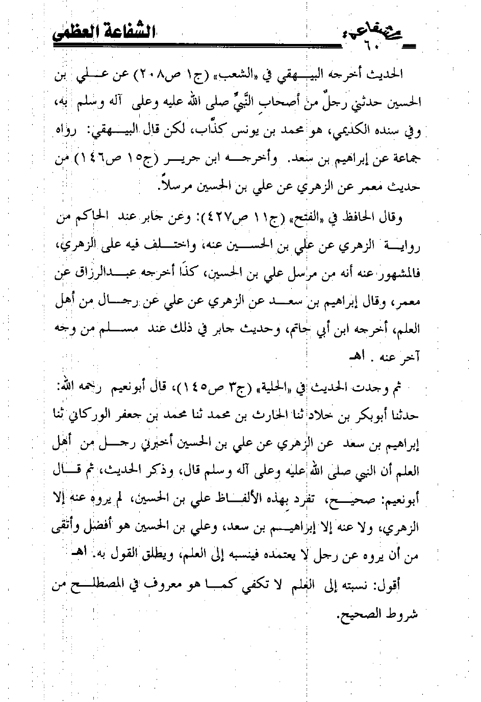 ثم وجدت الحديث في "الحلية" (ج3 ص145)، قال أبونعيم رحمه الله: حدثنا أبوبكر بن خلاد ثنا الحارث بن محمد ثنا محمد بن جعفر الوركاني ثنا إبراهيم بن سعد عن الزهري عن علي بن الحسين أخبرني رجل من أهل العلم أن النبي صلى الله عليه وعلى آله وسلم قال، وذكر الحديث، ثم قال أبونعيم: صحيح، تفرد بهذه الألفاظ علي بن الحسين، لم يروه عنه إلا الزهري، ولا عنه إلا إبراهيم بن سعد، وعلي بن الحسين هو أفضل وأتقى من أن يروه عن رجل لا يعتمده فينسبه إلى العلم، ويطلق القول به. اهـ