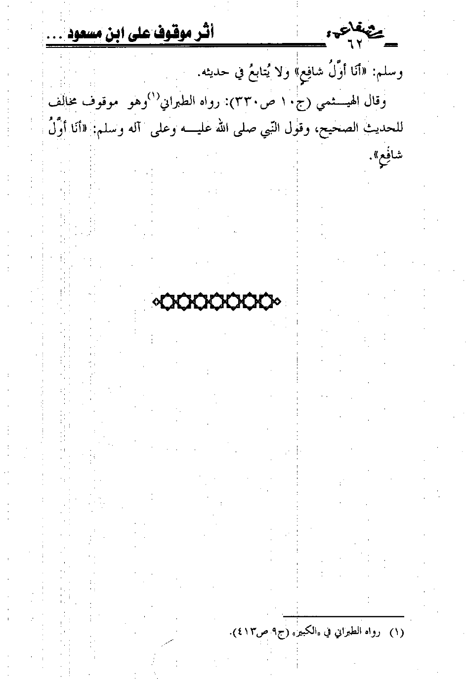 وقال الهيثمي (ج10 ص330): رواه الطبراني (¬1) وهو موقوف مخالف للحديث الصحيح، وقول النّبي صلى الله عليه وعلى آله وسلم: ((أنا أوّل شافع)).