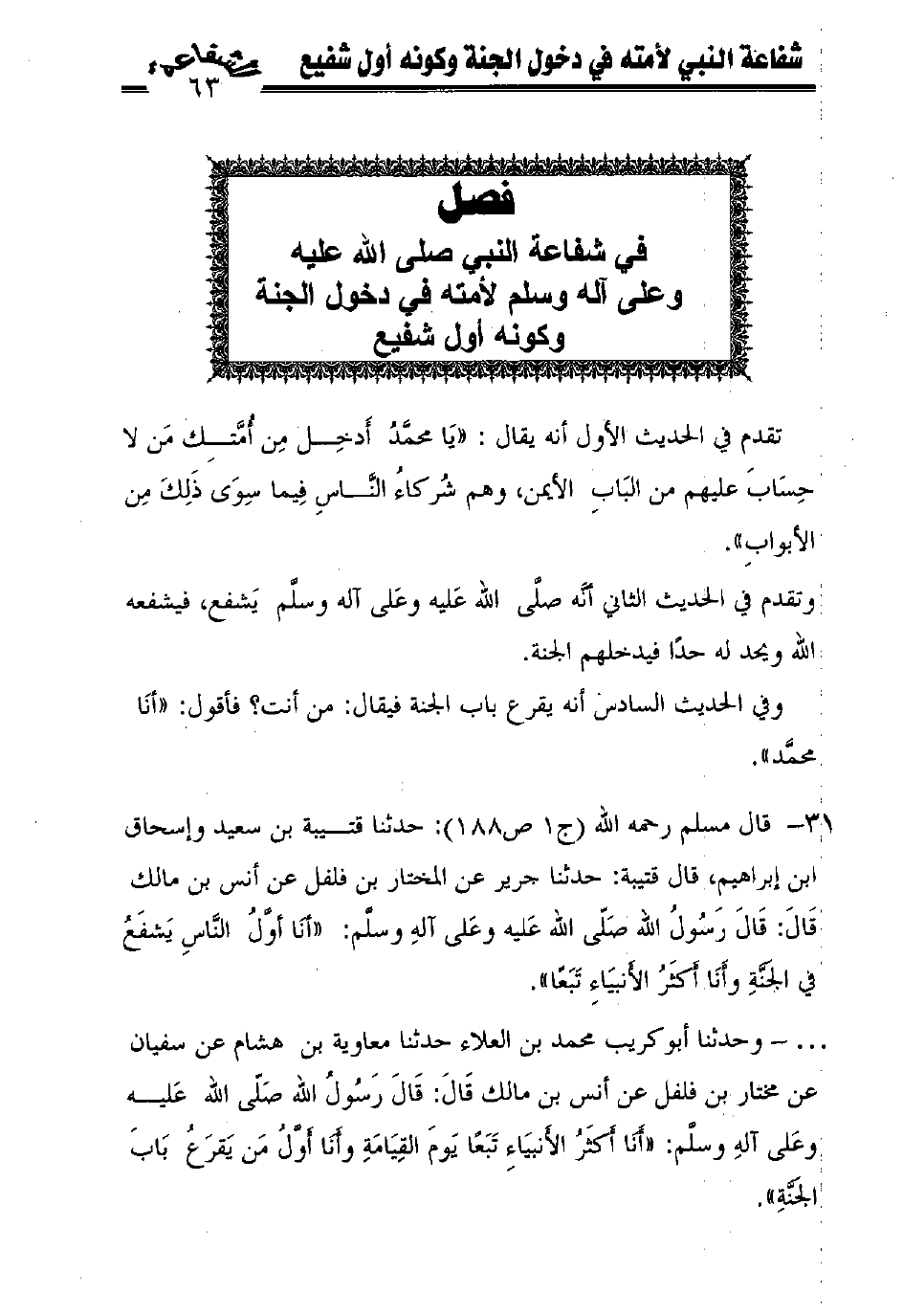 31 - قال مسلم رحمه الله (ج1 ص188): حدثنا قتيبة بن سعيد وإسحاق ابن إبراهيم، قال قتيبة: حدثنا جرير عن المختار بن فلفل عن أنس بن مالك قال: قال رسول الله صلّى الله عليه وعلى آله وسلّم: ((أنا أوّل النّاس يشفع في الجنّة وأنا أكثر الأنبياء تبعًا)).