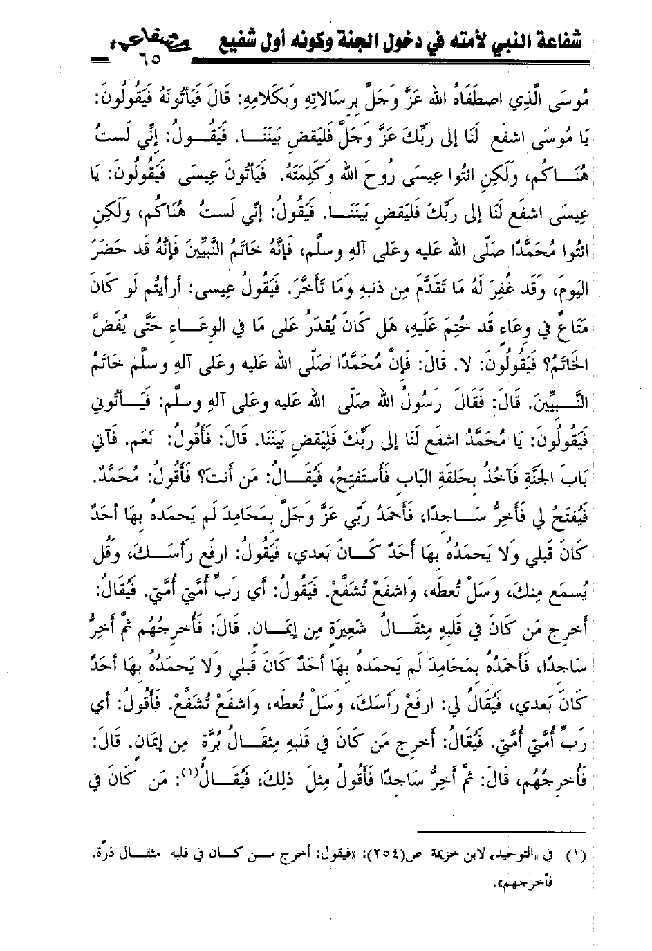 (¬1) التوحيد لابن خزيمة ص (254): ((فيقول: أخرج من كان في قلبه مثقال ذرّة. فأخرجهم)).