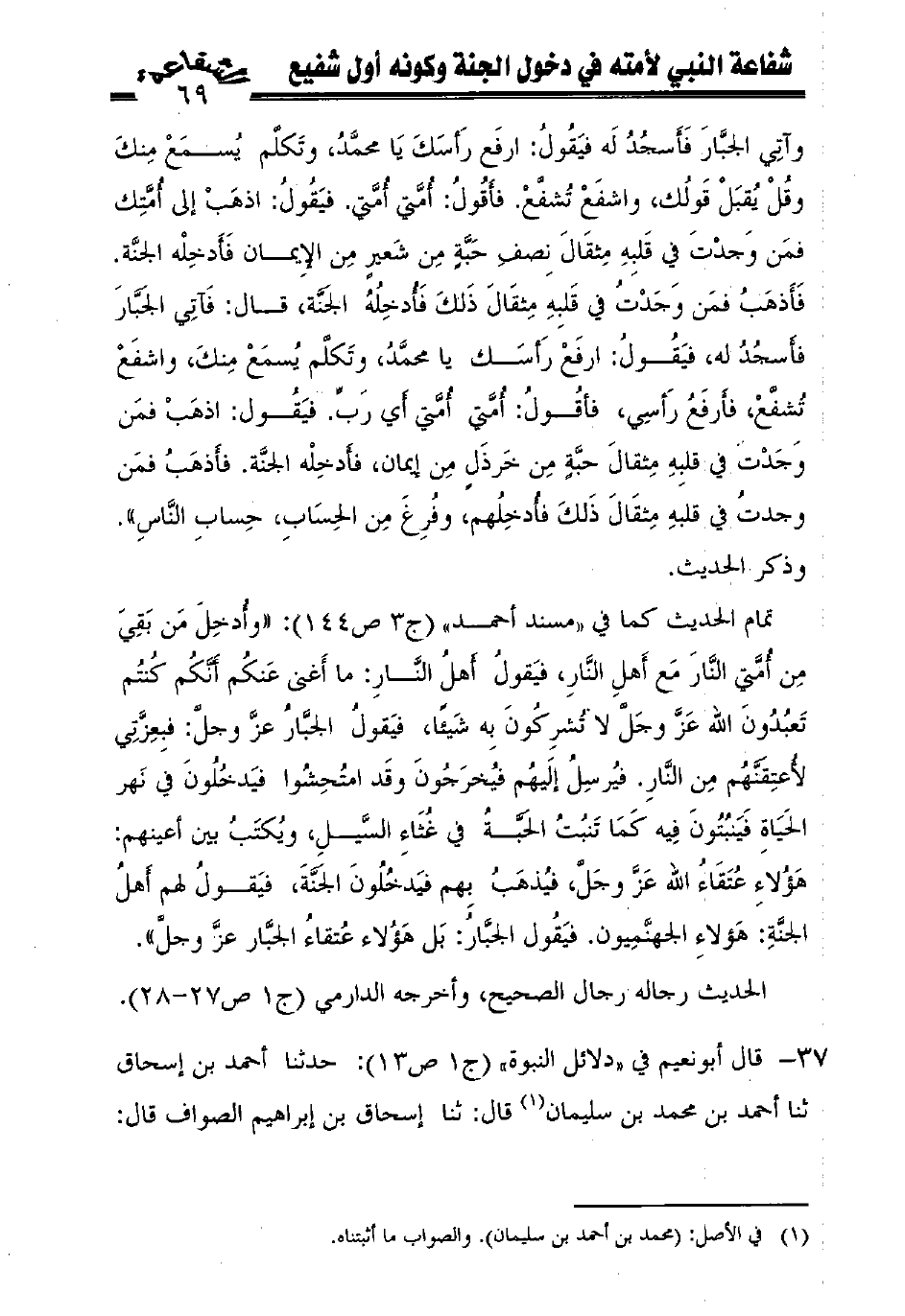 37 - قال أبونعيم في "دلائل النبوة" (ج1 ص13): حدثنا أحمد بن إسحاق ثنا أحمد بن محمد بن سليمان (¬1) قال: ثنا إسحاق بن إبراهيم الصواف قال: