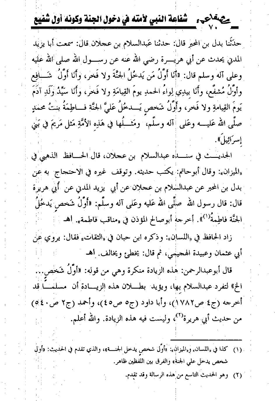 (¬1) في اللسان والميزان: ((أوّل شخص يدخل الجنة))، والذي تقدم في الحديث: ((أول شخص يدخل علي الجنة)) والفرق بين اللفظين ظاهر.