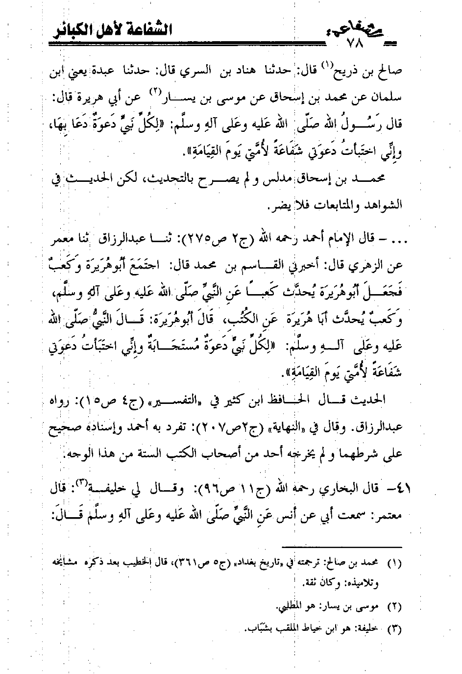 - قال الإمام أحمد رحمه الله (ج2 ص275): ثنا عبد الرزاق ثنا معمر عن الزهري قال: أخبرني القاسم بن محمد قال: اجتمع أبوهريرة وكعب فجعل أبوهريرة يحدّث كعبًا عن النّبيّ صلّى الله عليه وعلى آله وسلّم، وكعب يحدّث أبا هريرة عن الكتب، قال أبوهريرة: قال النّبيّ صلّى الله عليه وعلى آله وسلّم: ((لكلّ نبيّ دعوة مستجابة وإنّي اختبأت دعوتي شفاعةً لأمّتي يوم القيامة)).