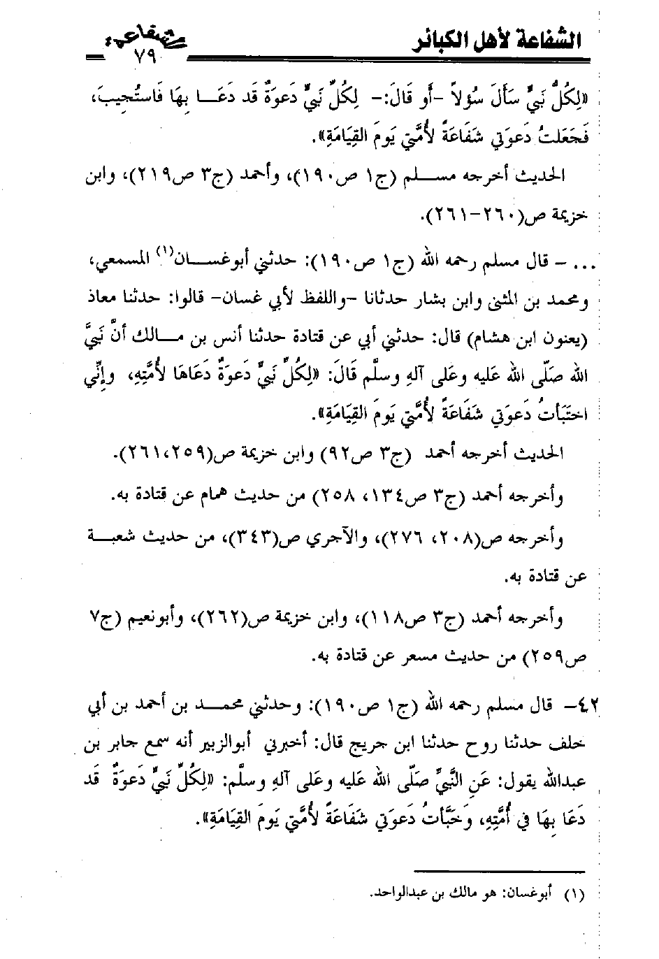 42 - قال مسلم رحمه الله (ج1 ص190): وحدثني محمد بن أحمد بن أبي خلف حدثنا روح حدثنا ابن جريج قال: أخبرني أبوالزبير أنه سمع جابر بن عبد الله يقول: عن النّبيّ صلّى الله عليه وعلى آله وسلّم: ((لكلّ نبيّ دعوة قد دعا بها في أمّته، وخبّأت دعوتي شفاعةً لأمّتي يوم القيامة)).