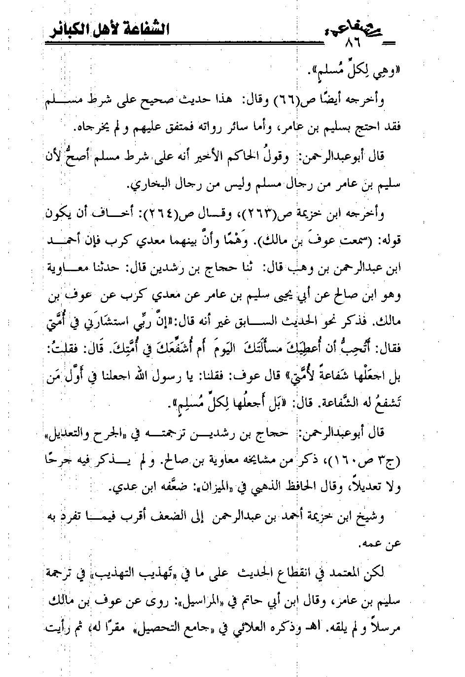 وأخرجه ابن خزيمة ص (263)، وقال ص (264): أخاف أن يكون قوله: (سمعت عوف بن مالك). وهْمًا وأنّ بينهما معدي كرب فإن أحمد ابن عبد الرحمن بن وهب قال: ثنا حجاج بن رشدين قال: حدثنا معاوية وهو ابن صالح عن أبي يحيى سليم بن عامر عن معدي كرب عن عوف بن مالك. فذكر نحو الحديث السابق غير أنه قال: ((إنّ ربّي استشارني في أمّتي فقال: أتحبّ أن أعطيك مسألتك اليوم أم أشفّعك في أمّتك. قال: فقلت: بل اجعلْها شفاعةً لأمّتي)) قال عوف: فقلنا: يا رسول الله اجعلنا في أوّل من تشفع له الشّفاعة. قال: ((بل أجعلها لكلّ مسلم)).