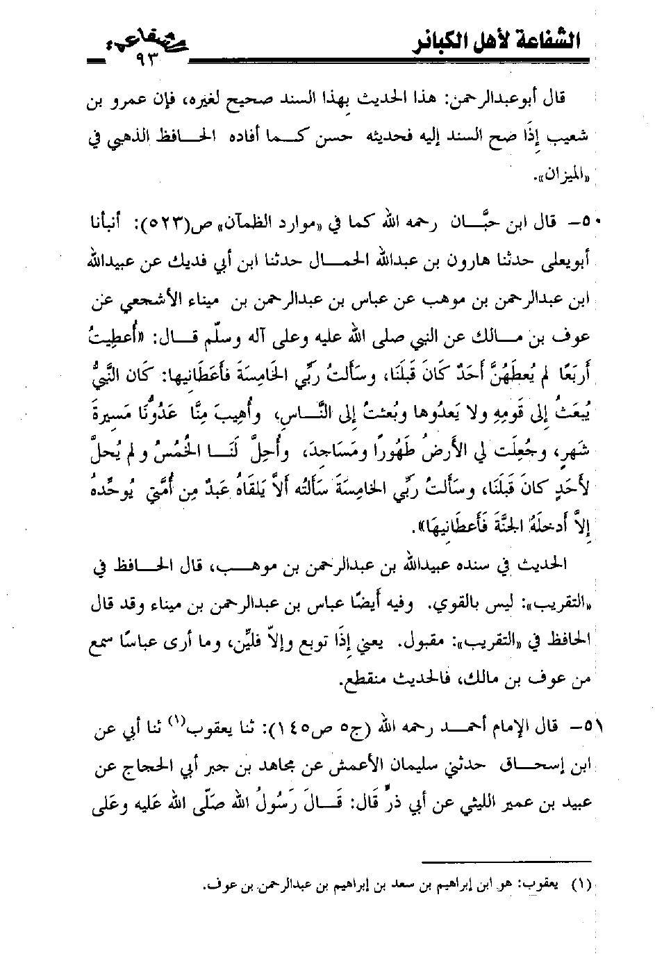 50 - قال ابن حبّان رحمه الله كما في "موارد الظمآن" ص (523): أنبأنا أبويعلى حدثنا هارون بن عبد الله الحمال حدثنا ابن أبي فديك عن عبيد الله ابن عبد الرحمن بن موهب عن عباس بن عبد الرحمن بن ميناء الأشجعي عن عوف بن مالك عن النبي صلى الله عليه وعلى آله وسلّم قال: ((أعطيت أربعًا لم يعطهنّ أحد كان قبلنا، وسألت ربّي الخامسة فأعطانيها: كان النّبيّ يبعث إلى قومه ولا يعدوها وبعثت إلى النّاس، وأهيب منّا عدوّنا مسيرة شهر، وجعلت لي الأرض طهورًا ومساجد، وأحلّ لنا الخمس ولم يحلّ لأحد كان قبلنا، وسألت ربّي الخامسة سألته ألاّ يلقاه عبد من أمّتي يوحّده إلاّ أدخله الجنّة فأعطانيها)).
