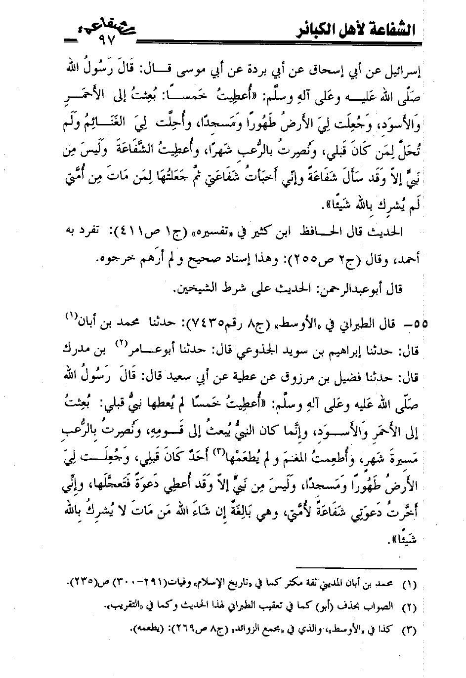 إسرائيل عن أبي إسحاق عن أبي بردة عن أبي موسى قال: قال رسول الله صلّى الله عليه وعلى آله وسلّم: ((أعطيت خمسًا: بعثت إلى الأحمر والأسود، وجعلت لي الأرض طهورًا ومسجدًا، وأحلّت لي الغنائم ولم تحلّ لمن كان قبلي، ونصرت بالرّعب شهرًا، وأعطيت الشّفاعة وليس من نبيّ إلاّ وقد سأل شفاعةً وإنّي أخبأت شفاعتي ثمّ جعلتها لمن مات من أمّتي لم يشرك بالله شيئًا)).