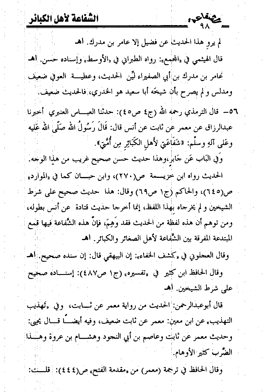 56 - قال الترمذي رحمه الله (ج4 ص45): حدثنا العباس العنبري أخبرنا عبد الرزاق عن معمر عن ثابت عن أنس قال: قال رسول الله صلّى الله عليه وعلى آله وسلّم: ((شفاعتي لأهل الكبائر من أمّتي)).