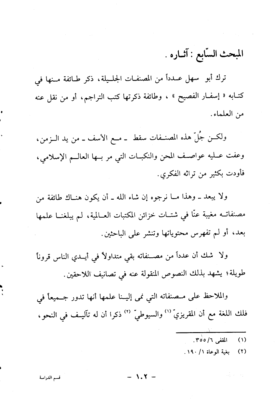 ترك أبو سهل عددا من المصنفات الجليلة، ذكر طائفة منها في كتابه "إسفار الفصيح"، وطائفة ذكرتها كتب التراجم، أو من نقل عنه من العلماء.