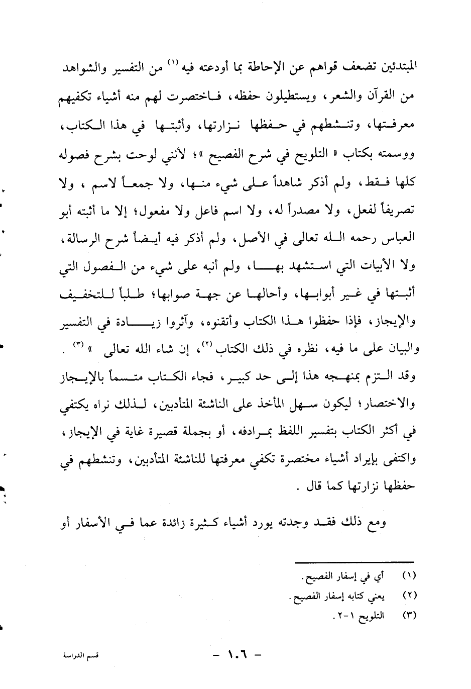 المبتدئين تضعف قواهم عن الإحاطة بما أودعته فيه1 من التفسير والشواهد من القرآن والشعر، ويستطيلون حفظه، فاختصرت لهم منه أشياء تكفيهم معرفتها، وتنشطهم في حفظها نزارتها، وأثبتها في هذا الكتاب، ووسمته بكتاب "التلويح في شرح الفصيح"، لأنني لوحت بشرح فصوله كلها فقط، ولم أذكر شاهدا على شيء منها، ولا جمعا لاسم، ولا تصريفا لفعل، ولا مصدرا له، ولا اسم فاعل ولا مفعول، إلا ما أثبته أبو العباس رحمه الله تعالى في الأصل، ولم أذكر فيه أيضا شرح الرسالة، ولا الأبيات التي استشهد بها، ولم أنبه على شيء من الفصول التي أثبتها في غير أبوابها، وأحالها عن جهة صوابها، طلبا للتخفيف والإيجار، فإذا حفظوا هذا الكتاب وأتقنوه، وآثروا زيادة في التفسير والبيان على ما فيه، نظره في ذلك الكتاب2، إن شاء الله تعالى "3. وقد التزم بمنهجه هذا إلى حد كبير، فجاء الكتاب متسما بالإيجاز والاختصار، ليكون سهل المأخذ على الناشئة المتأدبين، لذلك نراه يكتفي في أكثر الكتاب بتفسير اللفظ بمرادفه، أو بجملة قصيرة غاية في الإيجاز، واكتفى بإيراد أشياء مختصرة تكفي معرفتها للناشئة المتأدبين، وتنشطهم في حفظها نزارتها كما قال.