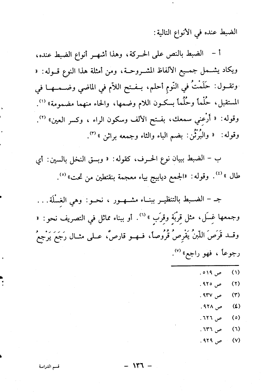 ج- الضبط بالتتنظير ببناء مشهور، نحو: وهي الغسلة.... وجمعها غسل، مثل قربة وقرب"6. أو ببناء مماثل في التصريف نحو: "وقد قرص اللبن يقرص قروصا، فهو قارص، على مثال رجع يرجع رجوعا، فهو راجع"7.