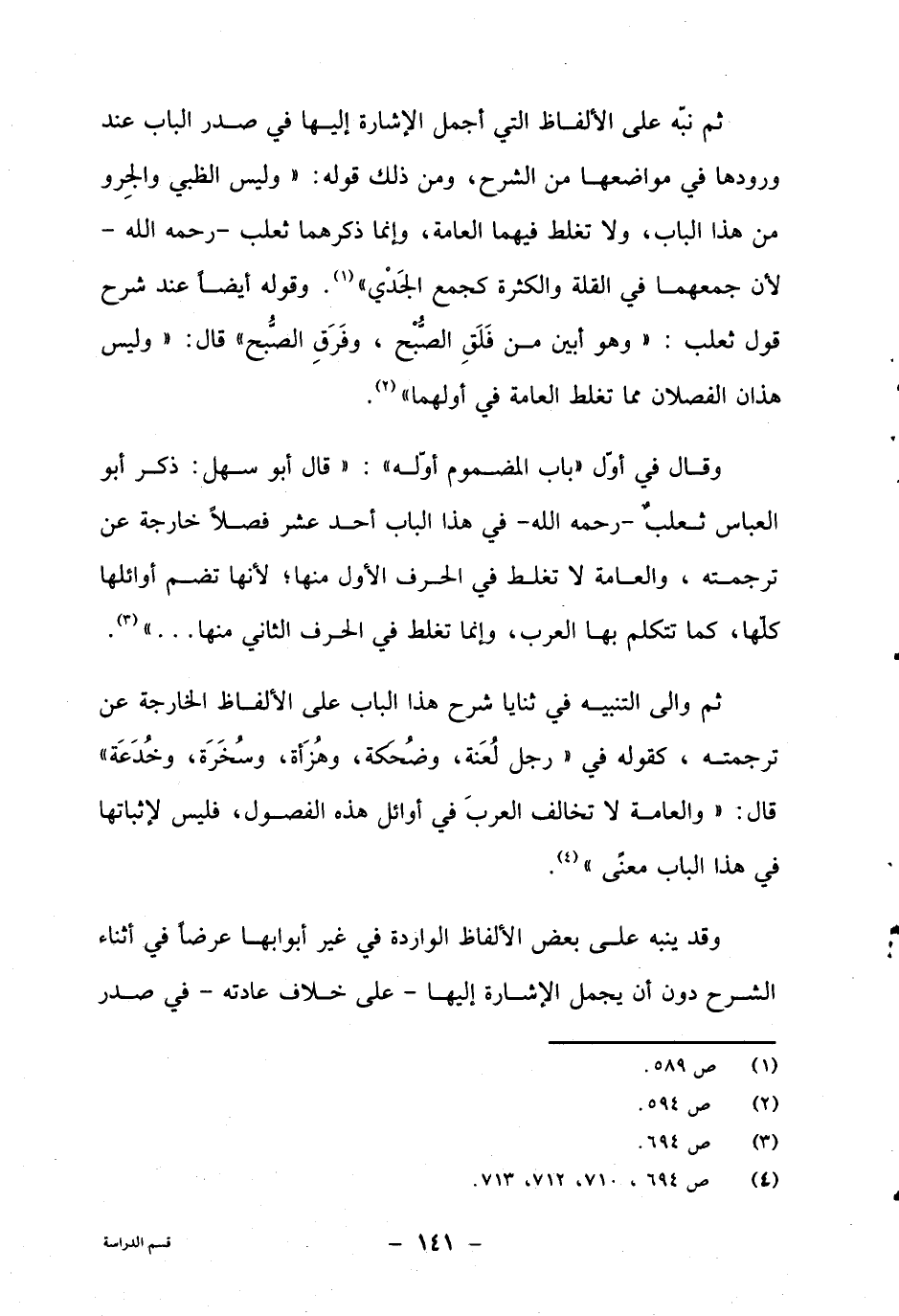 ثم نبه على الألفاظ التي أجمل الإشارة إليها في صدر الباب عند ورودها في مواضعها من الشرح، ومن ذلك قوله: "وليس الظبي والجرو من هذا الباب، ولا تغلط فيهما العامة، وإنما ذكرهما ثعلب – رحمه الله – لأن جمعهما في القلة والكثرة كجمع الجدي"1. وقوله أيضا عند شرح قول ثعلب: "وهو أبين من فلق الصبح، وفرق الصبح" قال: "وليس هذان الفصلان مما تغلط العامة في أولهما"2.