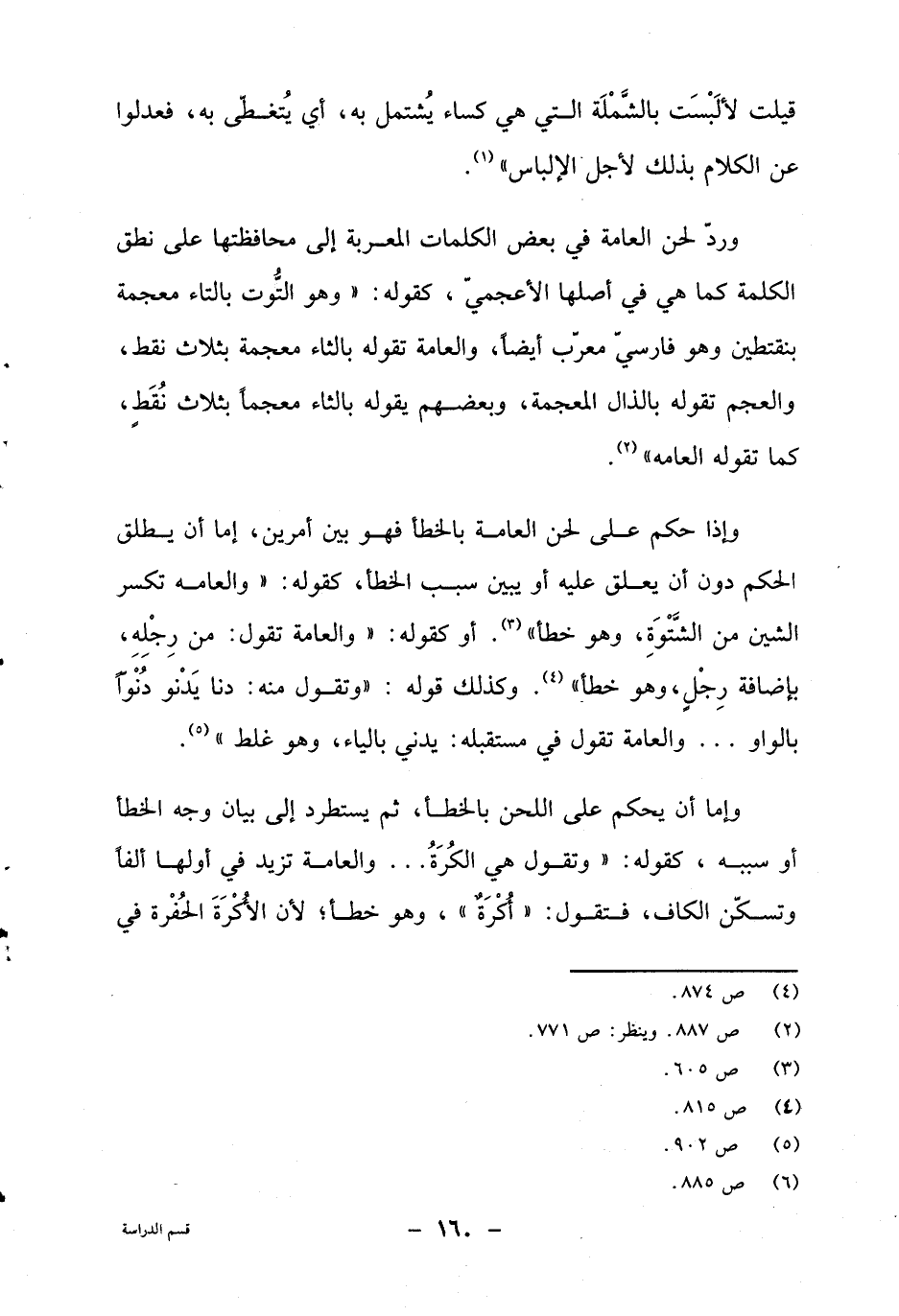 وإما أن يحكم على اللحن بالخطأ، ثم يستطرد إلى بيان وجه الخطأ أو سببه، كقوله: "وتقول هي الكُرَةُ..... والعامة تزيد في أولها ألفا وتسكن الكاف، فتقول: "أُكْرَة"، وهو خطأ، لأن الكرة الحفرة في