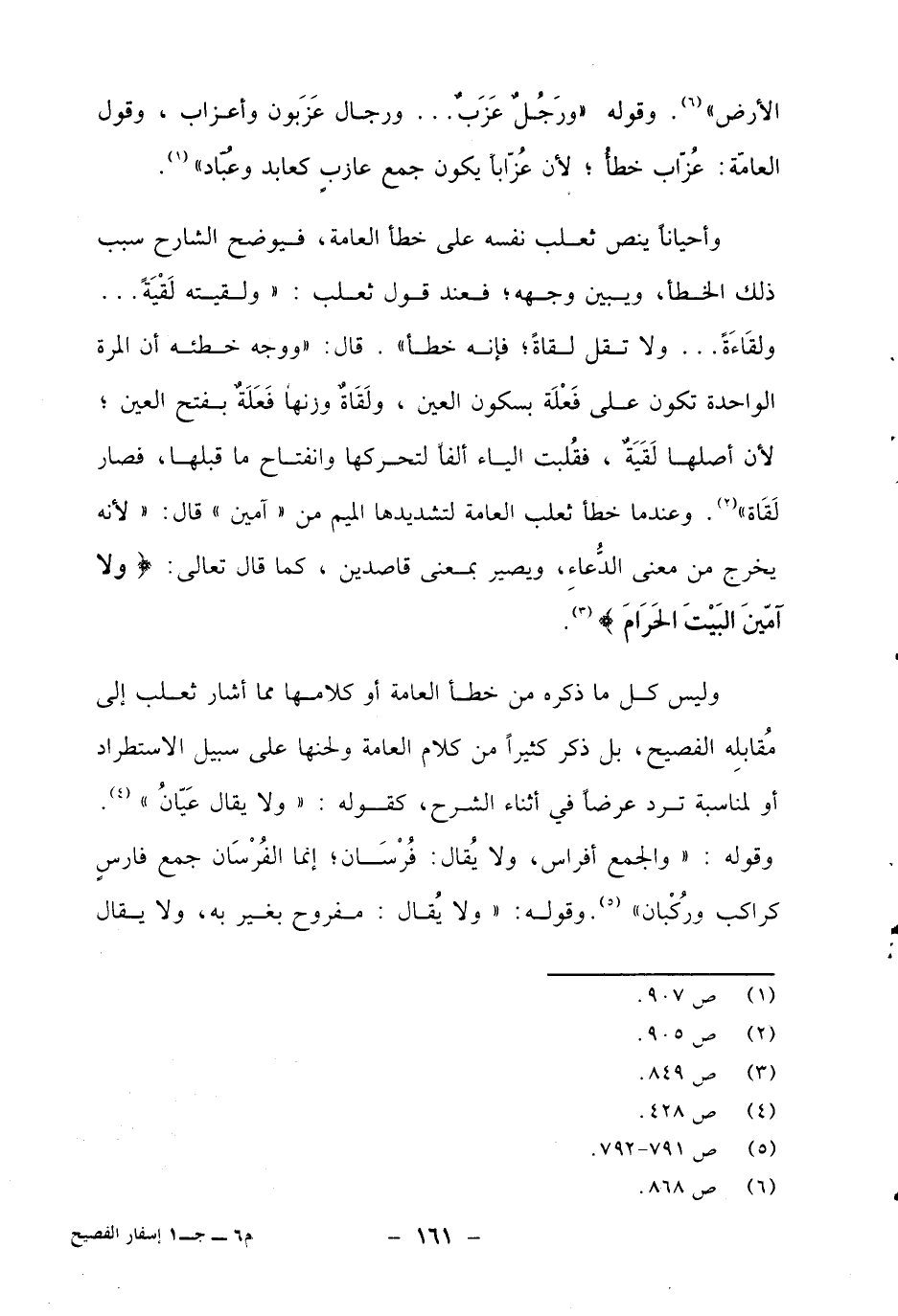 وليس كل ما ذكره من خطأ العامة أو كلامها مما أشار ثعلب إلى مقابله الفصيح، بل ذكر كثيرا من كلام العامة ولحنها على سبيل الاستطراد أو المناسبة ترد عرضا في أثناء الشرح، كقوله: "ولا يقال عيََان"5. وقوله: "والجمع أفراس، ولا يقال: فرسان، إنما الفرسان، جمع فارس كراكب وركبان"6. وقوله: "ولا يقال: مفروح بغير به، ولا يقال