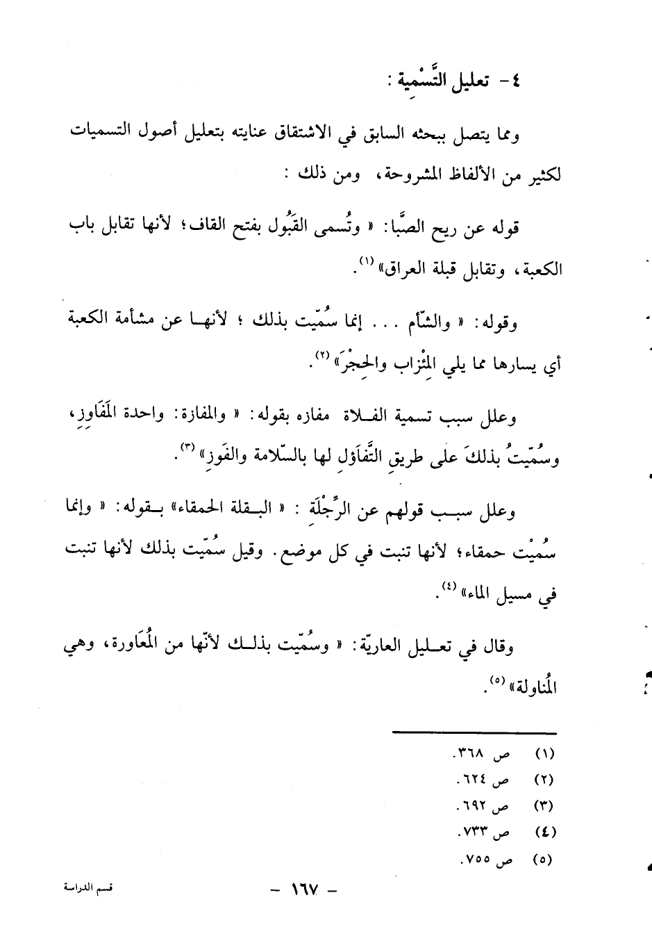 ومما يتصل ببحثه السابق في الاشتقاق عنايته بتعليل أصول التسميات لكثير من الألفاظ المشروحة، ومن ذلك: