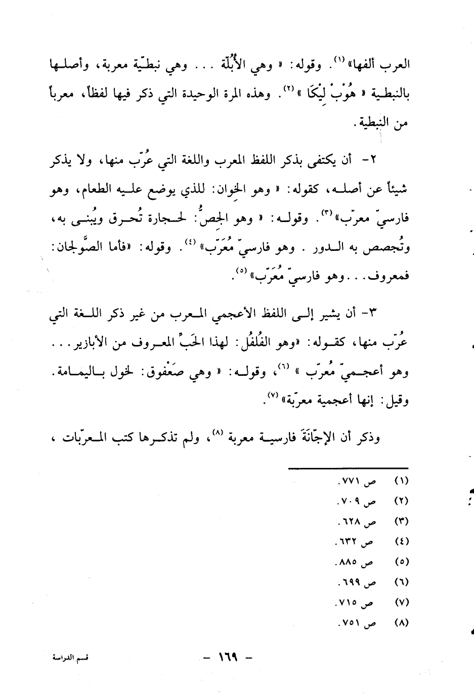 2- أ، يشير إلى اللفظ الأعجمي المعرب من غير ذكر اللغة التي عرب منها، كقوله: "وهو الفلفل: لهذا الحب المعروف من الأباريز.... وهو أعجمي معرب"6، وقوله: "وهي صعفوق: لخول باليمامة. وقيل: إنها أعجمية معربة"7.
