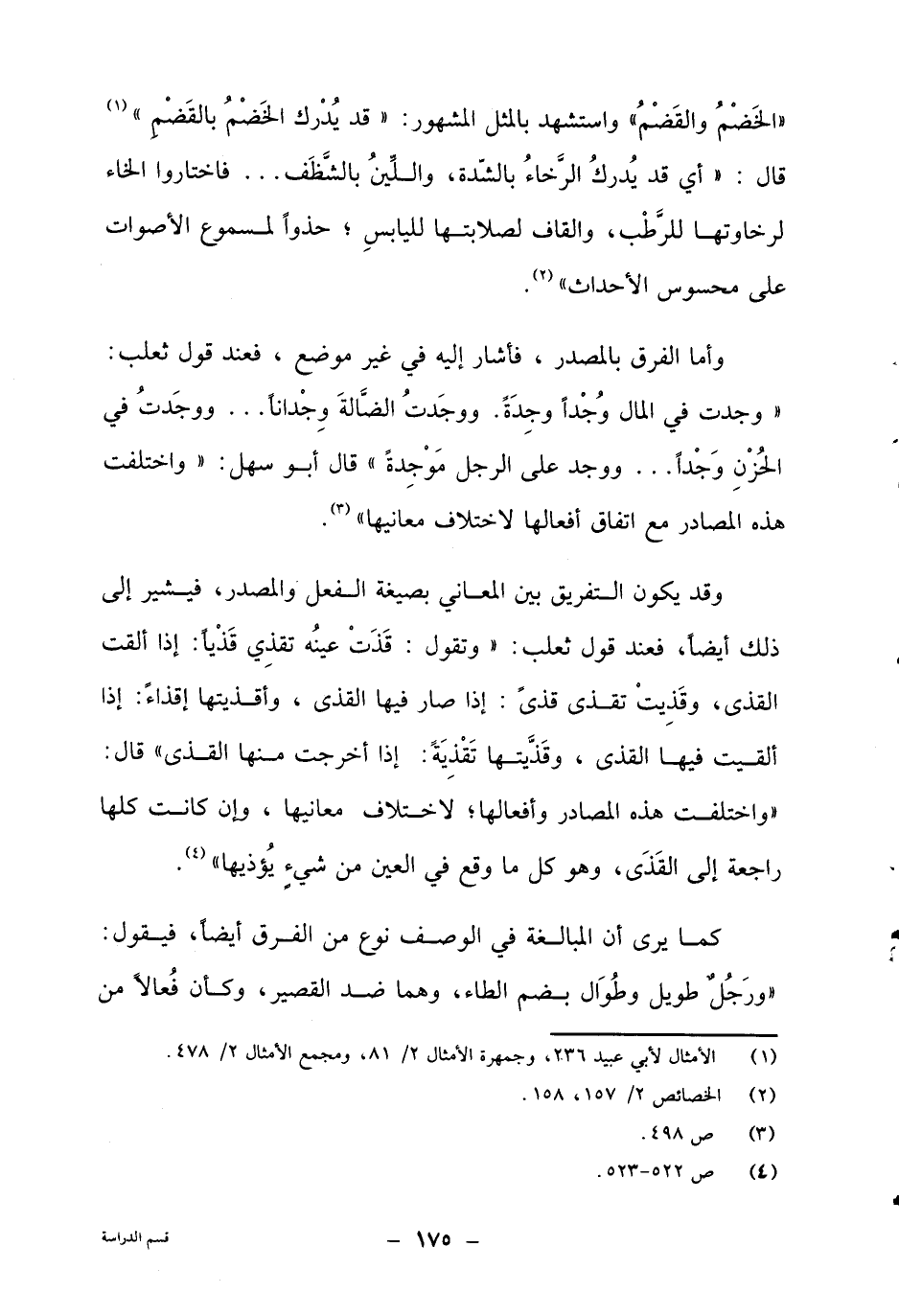 وقد يكون التفريق بين المعاني بصيغة الفعل والمصدر، فيشير إلى ذلك أيضا، فعند قول ثعلب: "وتقول: قذت عينه تقذي قذيا: إذا ألقت القذى، وقذيت تقذي قذى: إذا صار فيها القذى، وأقذيتها إقذاءا: إذا ألقيت فيها القذى، وقذيتها تقذية: إذا أخرجت منها القذى" قال: "واختلفت هذه المصادر وأفعالها، لاختلاف معانيها، وإن كانت كلها رجعة إلى القذى، وهو كل ما وقع في العين من شيء يؤذيها"4.