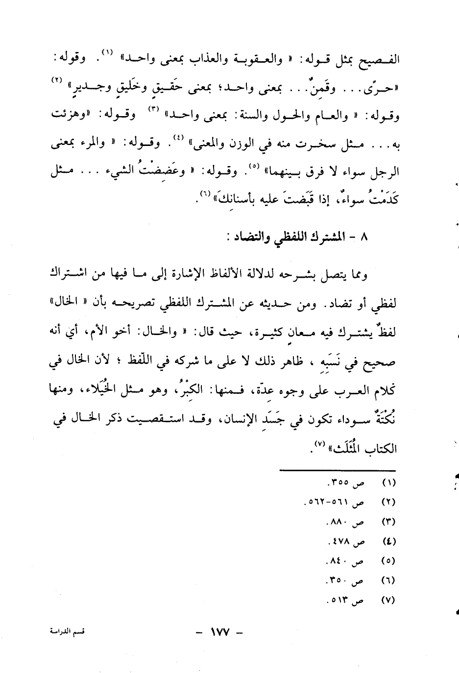 ومما يتصل يشرحه لدلالة الألفاظ الإشارة إلى ما فيها من اشتراك لفظي أو تضاد. ومن حديثه عن المشترك اللفظي تصريحه بأن " الخال " لفظ يشترك فيه معان كثيرة، حيث قال: "والخال: أخو الأم، أي أنه صحيح في نسبه، ظاهر ذلك لا على ما شركه في اللفظ، لأن الخال في كلام العرب على وجوه عدة، فمنها: الكبر، وهو مثل الخيلاء، ومنها نكتة سوداء تكون في جسد الإنسان، وقد استقصيت ذكر الخال في الكتاب المثلث"7.