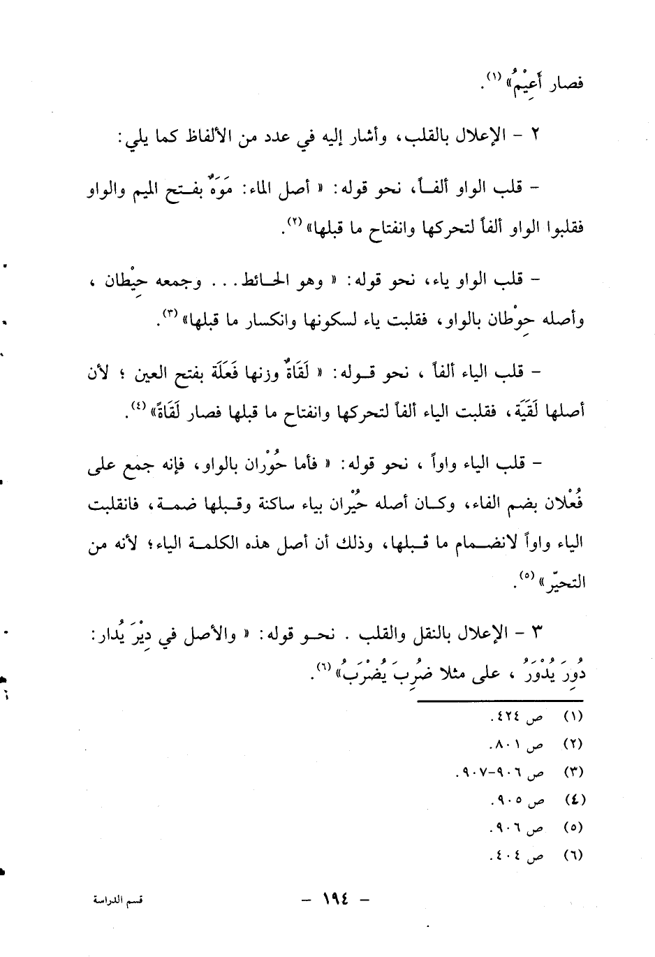 3- الإعلال بالنقل والقلب. نحو قوله: "والأصل في دير يدار: دور يدور، على مثلا ضرب يضرب"6.