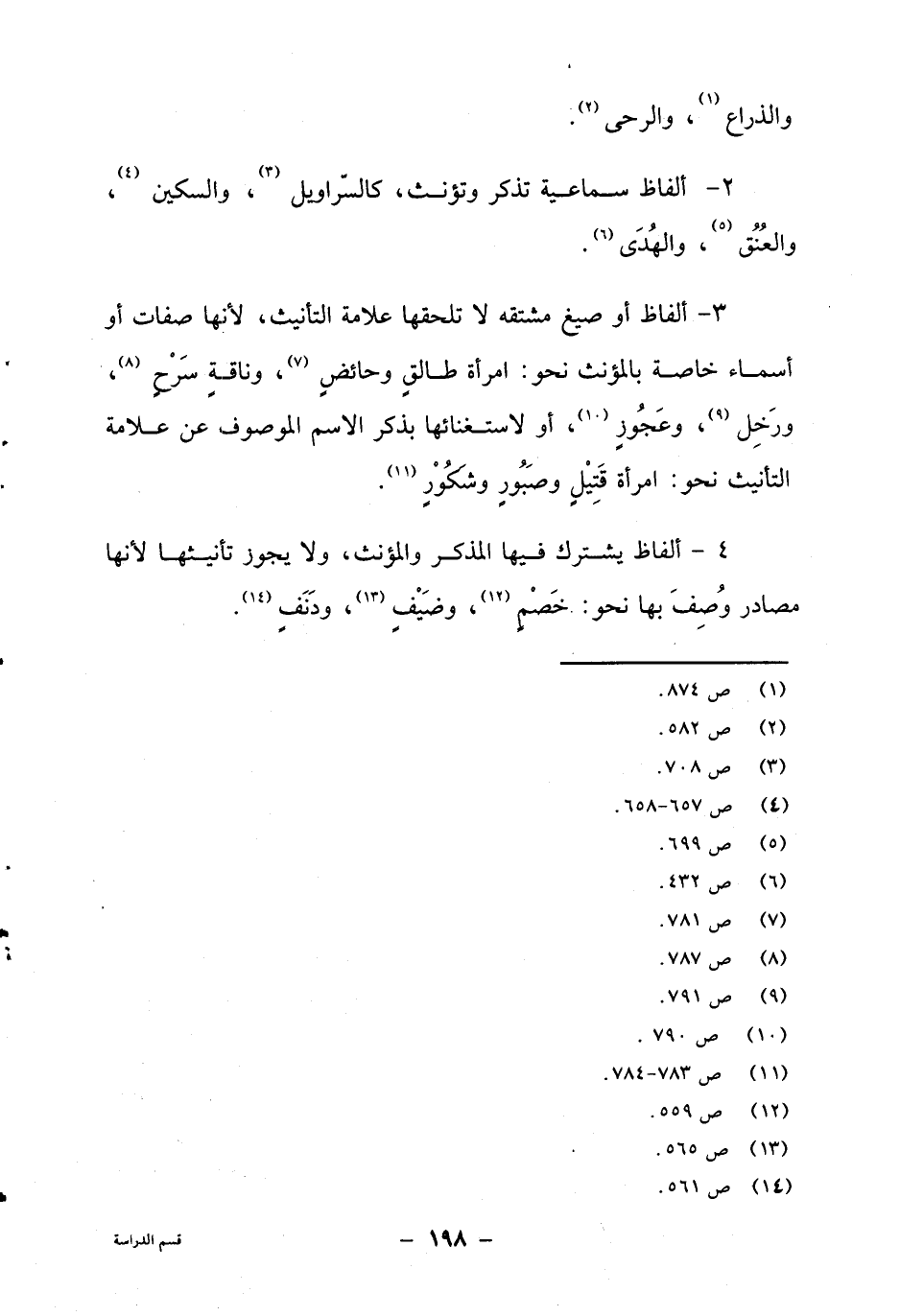 3- ألفا أو صيغ مشتقة لا تلحقها علامة التأنيث، لأنها صفات أو أسماء خاصة بالمؤنث نحو: امرأة طالق وحائض7، وناقة سرح8، ورخل9، وعجوز10، أو لاستغنائها بذكر الاسم الموصوف عن علامة التأنيث نحو: امرأة قتيل وصبور وشكور11.