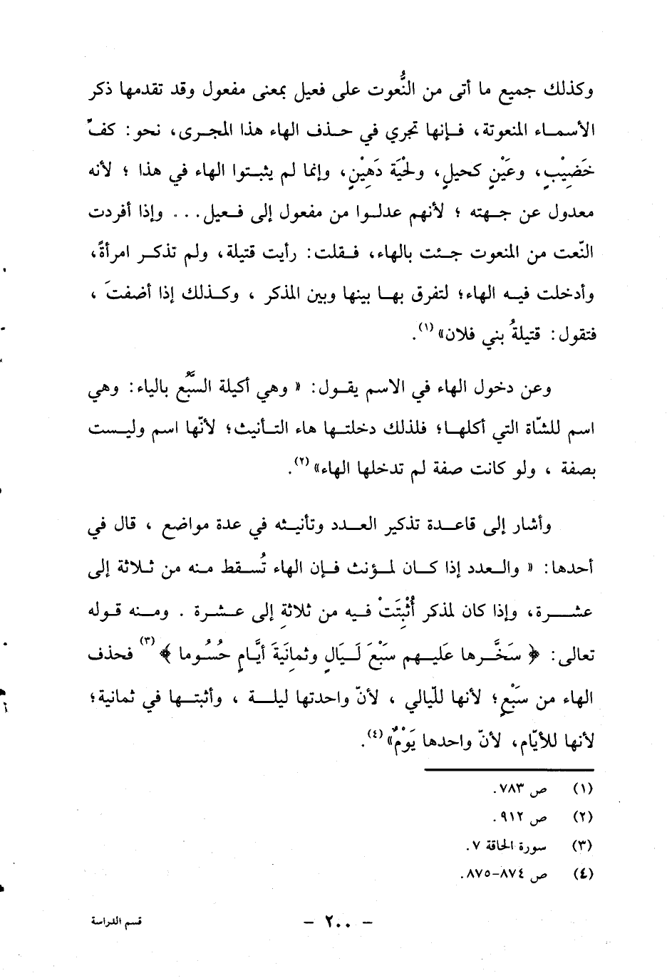 وأشار إلى قاعدة تذكير العدد وتأنيثه في عدة مواضع، قال في أحدها: "والعدد إذا كان لمؤنث فإن الهاء تسقط منه من ثلاثة إلى عشرة، وإذا كان لمذكر أثبتت فيه من ثلاثة إلى عشرة. ومنه قوله تعالى: {سَخَّرَهَا عَلَيْهِمْ سَبْعَ لَيَالٍ وَثَمَانِيَةَ أَيَّامٍ حُسُوماً} 3 فحذف الهاء من سبع، لأنها الليالي، لأن واحدتها ليلة، وأثبتها في ثمانية، لأنها للأيام، لأن واحدها يوم"4.
