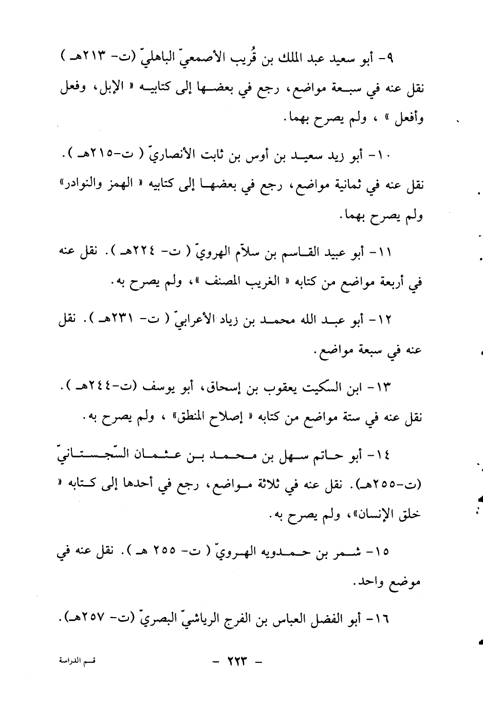 14- أبو حاتم سهل بن محمد بن عثمان السجستاني (ت- 255 هـ) ، نقل عنه في ثلاثة مواضع، رجع في أحدهما إلى كتابه "خلق الإنسان"، ولم يصرح به.